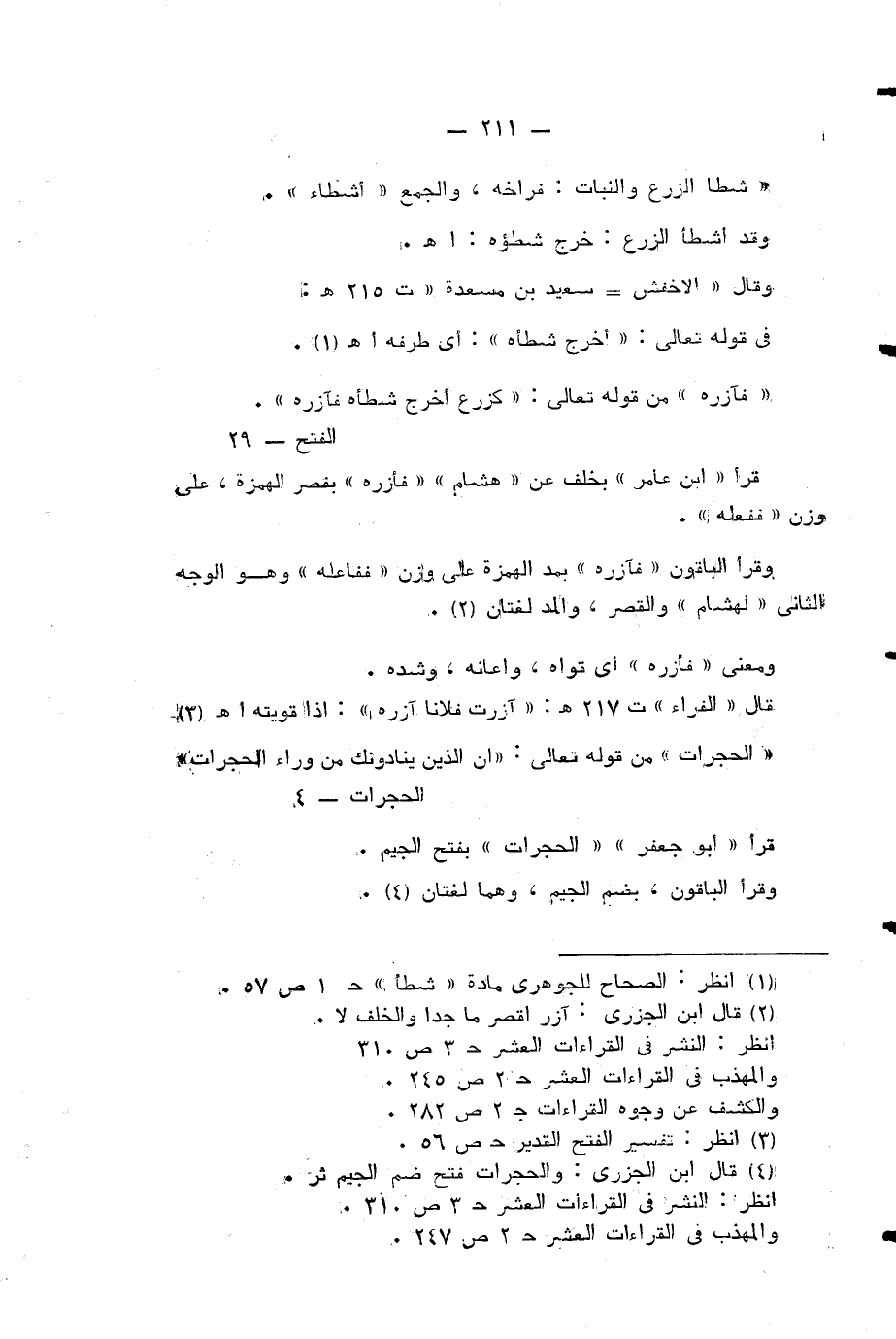قال «الفراء» ت 217 هـ: «آزرت فلانا آزره»: اذا قويته اهـ (¬4) «الحجرات» من قوله تعالى: إِنَّ الَّذِينَ يُنادُونَكَ مِنْ وَراءِ الْحُجُراتِ (¬5) قرأ «ابو جعفر» «الحجرات» بفتح الجيم.