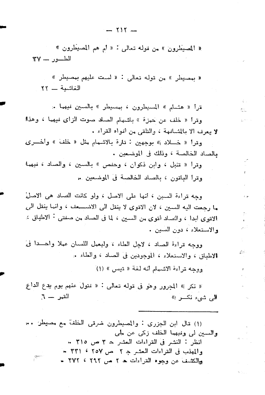 ووجه قراءة الصاد، لاجل الطاء، وليعمل اللسان عملا واحدا في الاطباق، والاستعلاء، الموجودين في الصاد، والطاء ووجه قراءة الاشمام انه لغة «قيس» (¬3) «نكر» المجرور وهو في قوله تعالى: فَتَوَلَّ عَنْهُمْ يَوْمَ يَدْعُ الدَّاعِ إِلى شَيْءٍ نُكُرٍ (¬4)