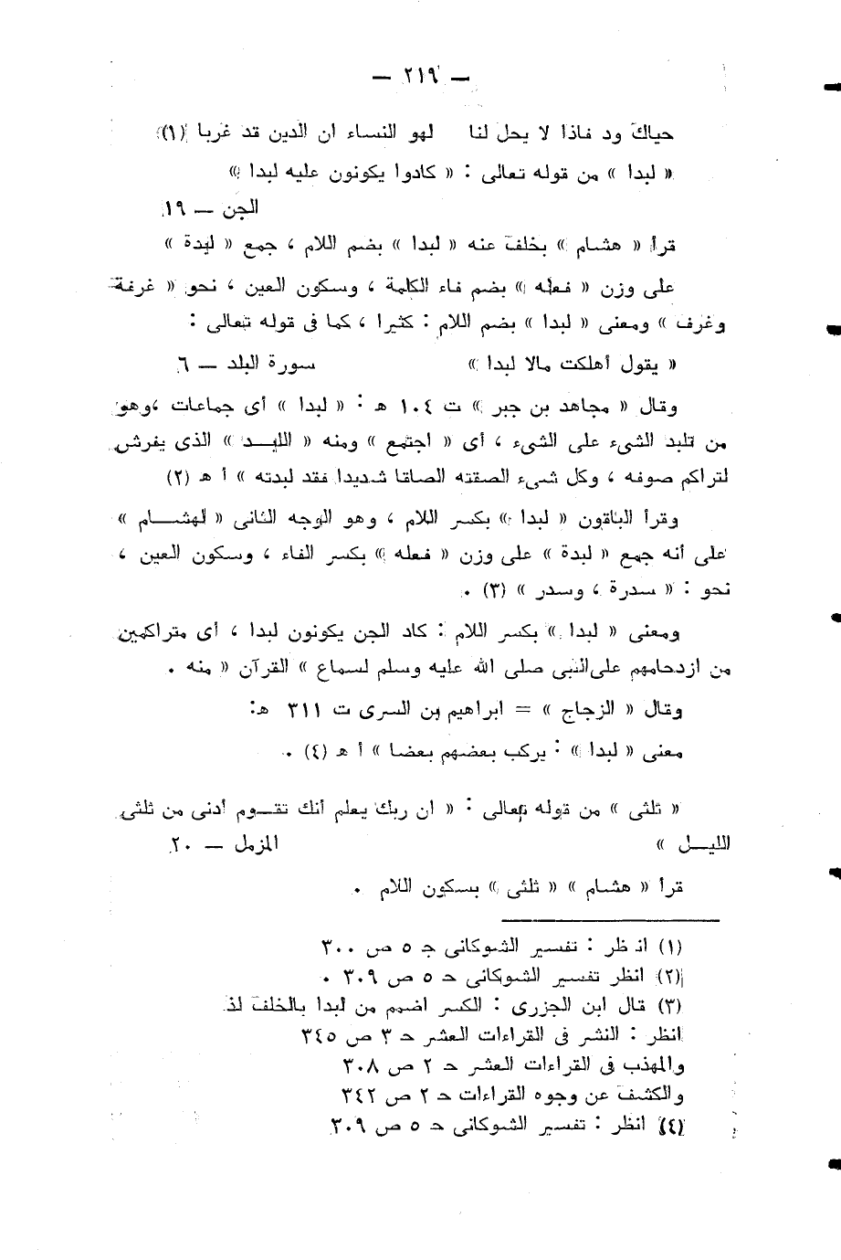 حياك ود فاذا لا يحل لنا ... لهو النساء ان الدين قد غربا (¬1) «لبدا» من قوله تعالى: كادُوا يَكُونُونَ عَلَيْهِ لِبَداً (¬2)