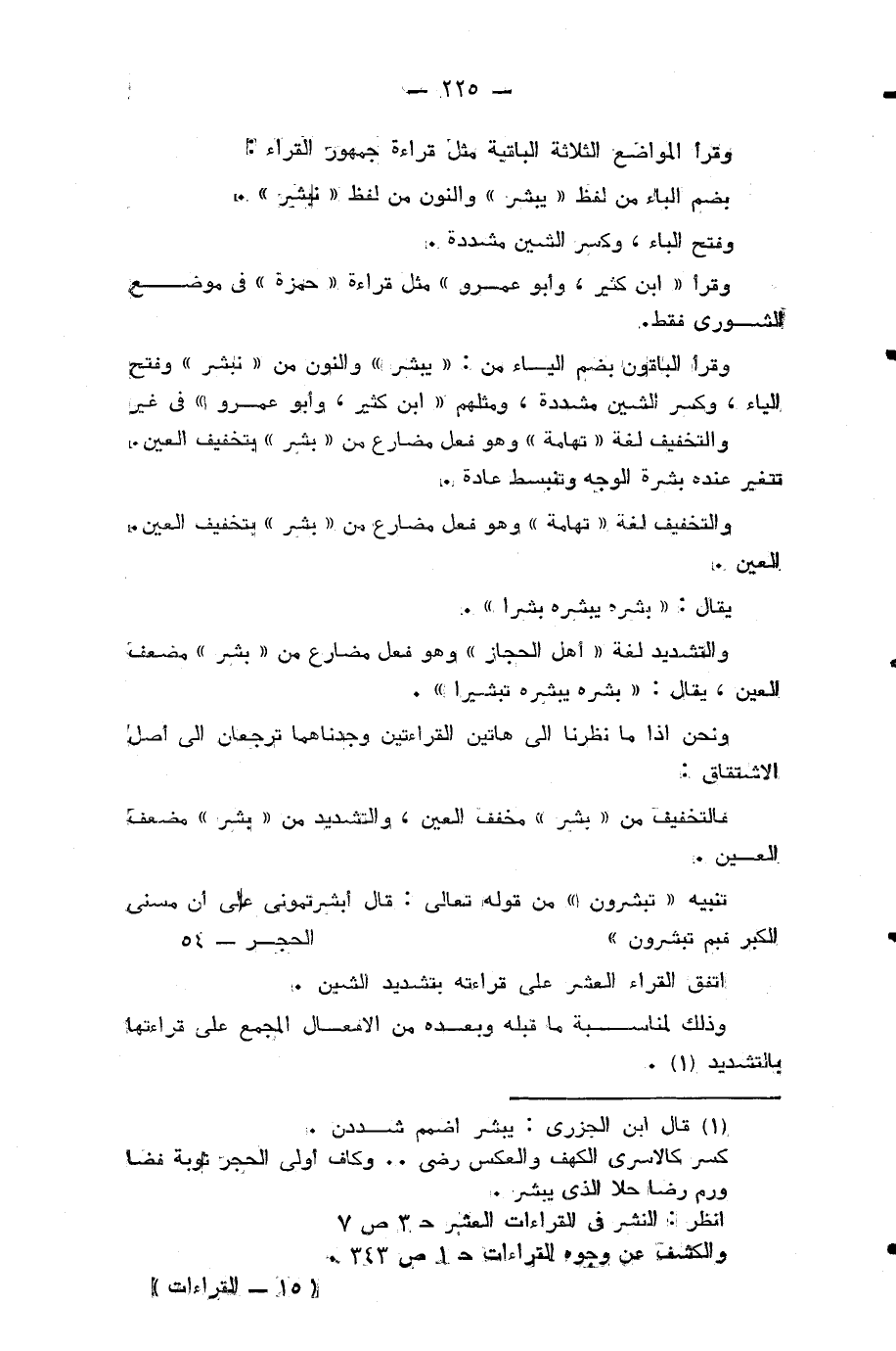 والتشديد لغة «اهل الحجاز» وهو فعل مضارع من «بشر» مضعف العين، يقال: «بشره يبشره تبشيرا».