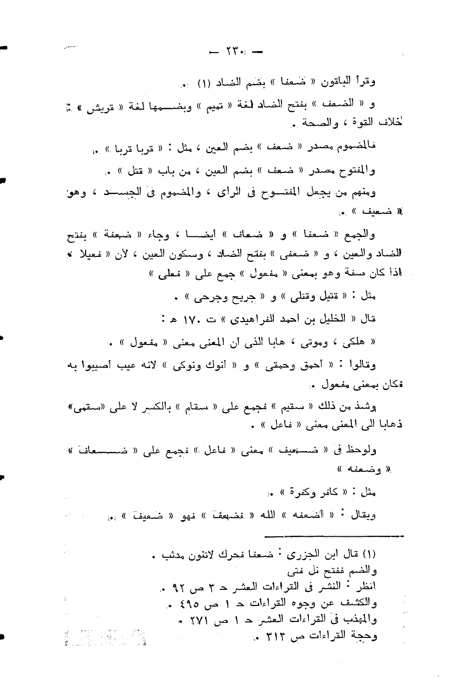 والجمع «ضعفا» و «ضعاف» ايضا، وجاء «ضعفة» بفتح الضاد والعين، و «ضعفي» بفتح الضاد، وسكون العين، لان «فعيلا، اذا كان صفة وهو بمعنى «مفعول» جمع على «فعلى» مثل: «قتيل وقتلى» و «جريح وجرحى» قال «الخليل بن احمد الفراهيدي» ت 170 هـ: