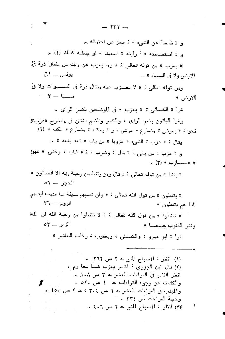 (¬4) قال ابن الجزري: اكسر يعزب ضما معا رم انظر النشر في القراءات العشر ح 3 ص 108 والكشف عن وجوه القراءات ح 1 ص 520.