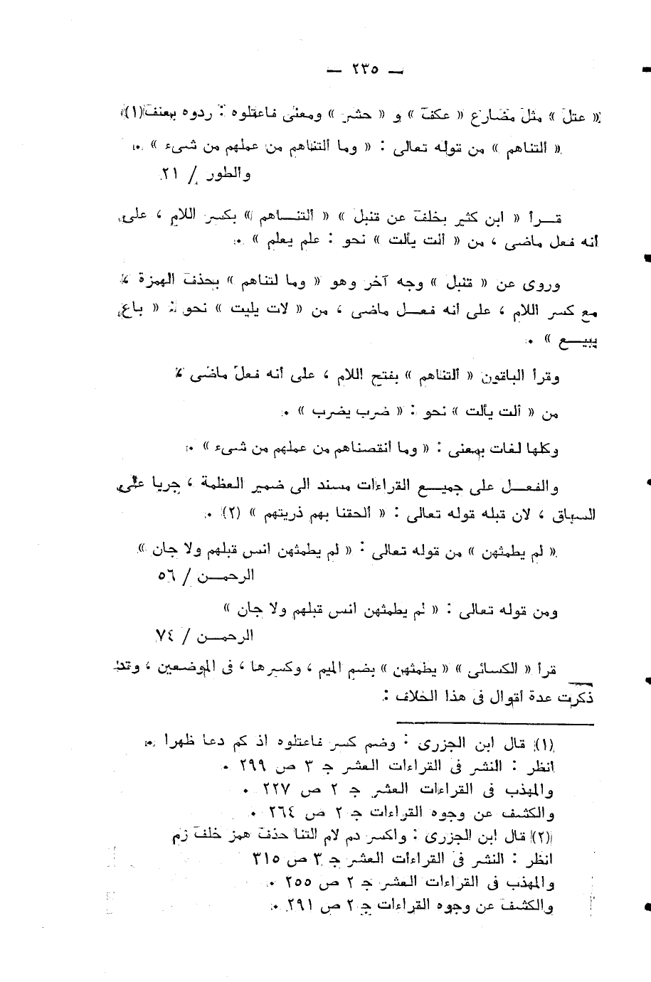 وقرأ الباقون «ألتناهم» بفتح اللام، على انه فعل ماض، من «ألت يألت» نحو: «ضرب يضرب».
