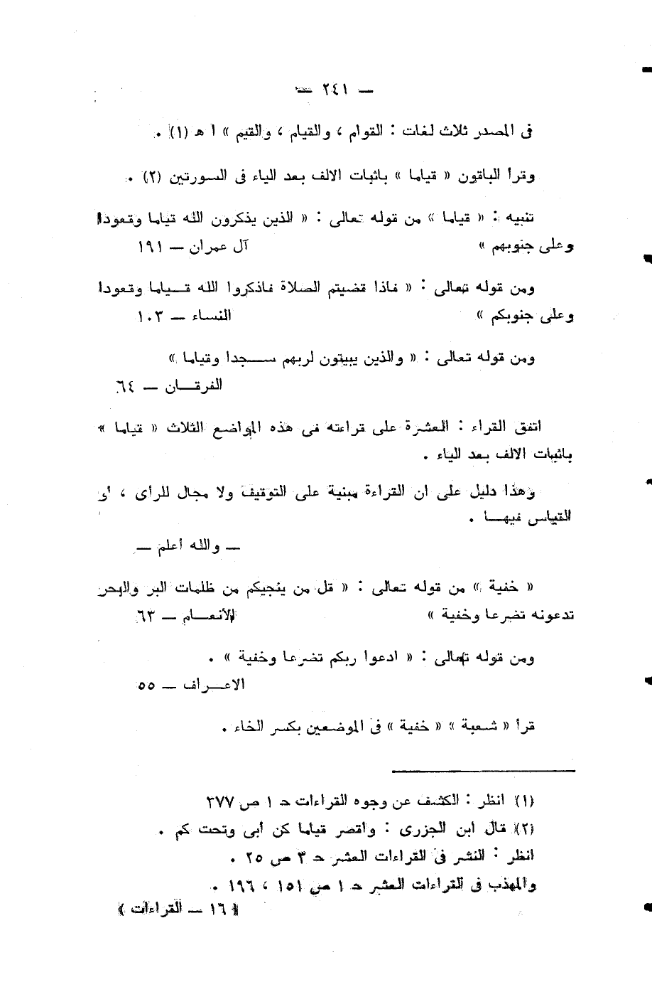 تنبيه: «قياما» من قوله تعالى: الَّذِينَ يَذْكُرُونَ اللَّهَ قِياماً وَقُعُوداً وَعَلى جُنُوبِهِمْ (¬3) ومن قوله تعالى: فَإِذا قَضَيْتُمُ الصَّلاةَ فَاذْكُرُوا اللَّهَ قِياماً وَقُعُوداً وَعَلى جُنُوبِكُمْ (¬4) ومن قوله تعالى: وَالَّذِينَ يَبِيتُونَ لِرَبِّهِمْ سُجَّداً وَقِياماً (¬5) اتفق القراء: العشرة على قراءته في هذه المواضع الثلاث «قياما» باثبات الالف بعد الياء.