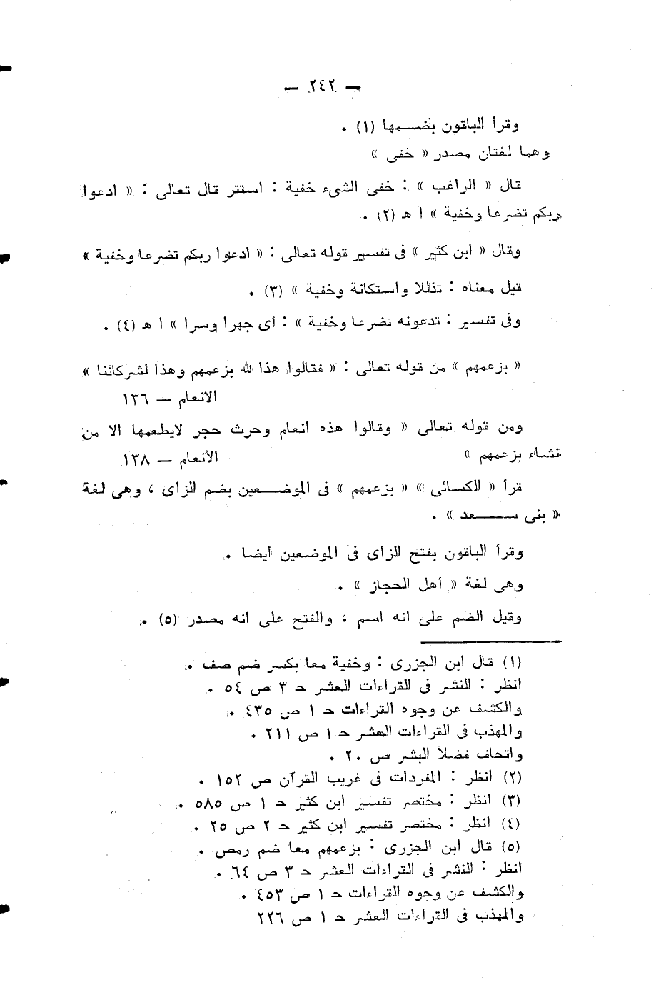 وفي تفسير: تدعونه تضرعا وخفية»: اي جهرا وسرا» اهـ (¬4) «بزعمهم» من قوله تعالى: فَقالُوا هذا لِلَّهِ بِزَعْمِهِمْ وَهذا لِشُرَكائِنا (¬5) ومن قوله تعالى وَقالُوا هذِهِ أَنْعامٌ وَحَرْثٌ حِجْرٌ لا يَطْعَمُها إِلَّا مَنْ نَشاءُ بِزَعْمِهِمْ (¬6) قرأ «الكسائي» «بزعمهم» في الموضعين بضم الزاي، وهي لغة «بني سعد».