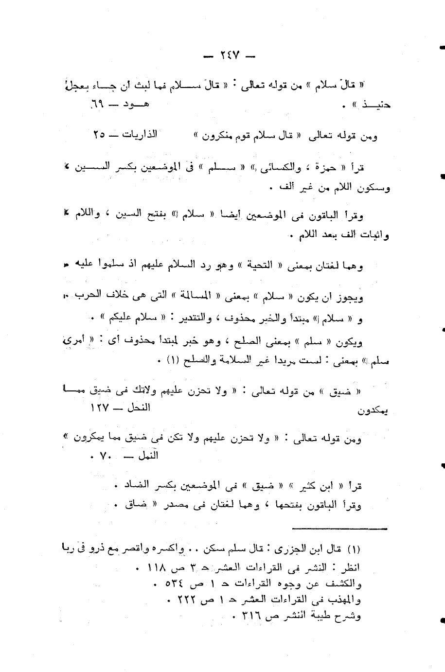 «قال سلام» من قوله تعالى: قالَ سَلامٌ فَما لَبِثَ أَنْ جاءَ بِعِجْلٍ حَنِيذٍ (¬1) ومن قوله تعالى قالَ سَلامٌ قَوْمٌ مُنْكَرُونَ (¬2) قرأ «حمزة، والكسائي» «سلم» في الموضعين ايضا «سلام» بفتح السين، واللام، واثبات الف بعد اللام.