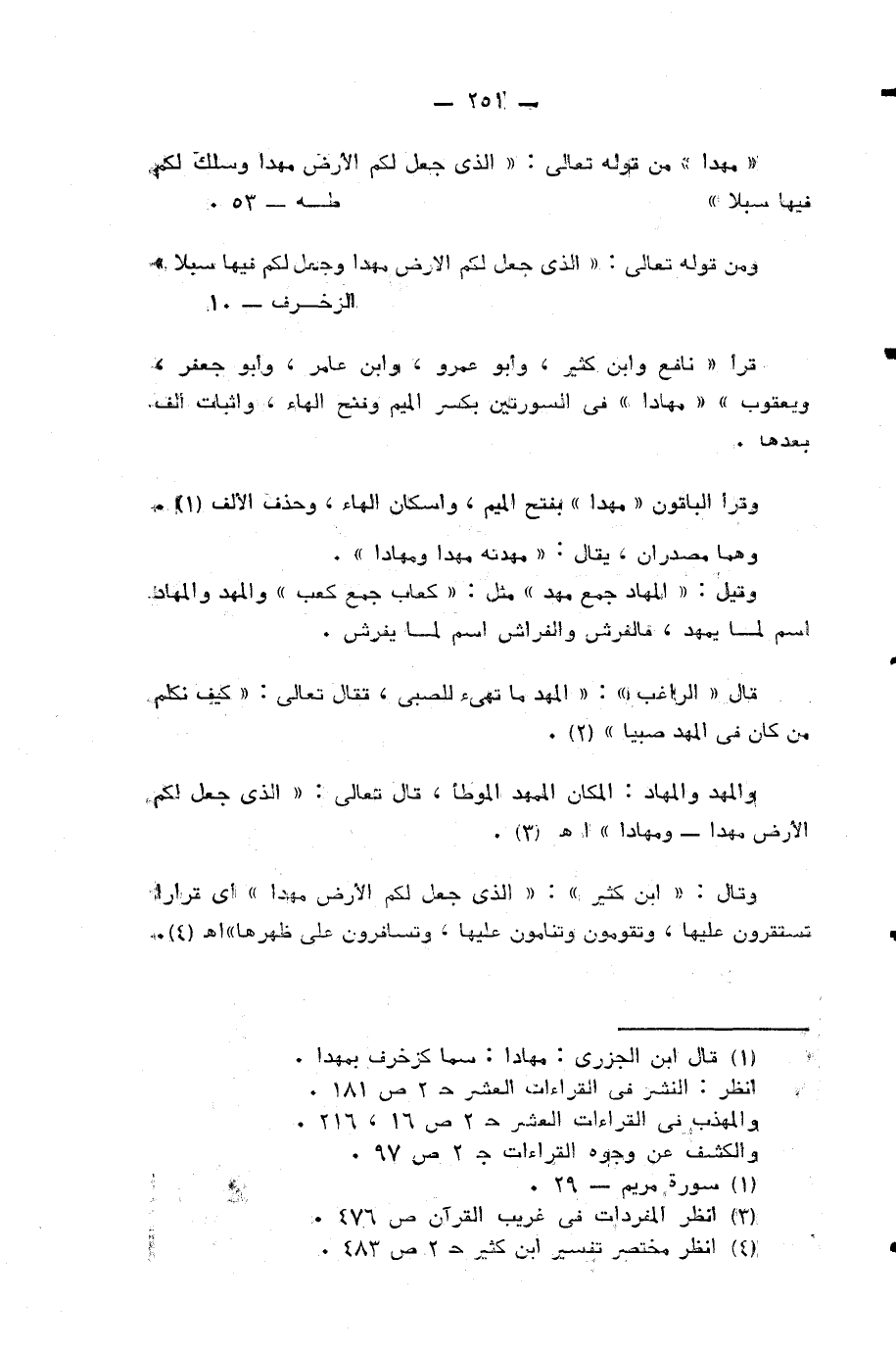 ومن قوله تعالى: الَّذِي جَعَلَ لَكُمُ الْأَرْضَ مَهْداً وَجَعَلَ لَكُمْ فِيها سُبُلًا (¬2) قرأ «نافع وابن كثير، وابو عمرو، وابن عامر، وابو جعفر، ويعقوب» «مهادا» في السورتين بكسر الميم وفتح الهاء، واثبات الف بعدها.
