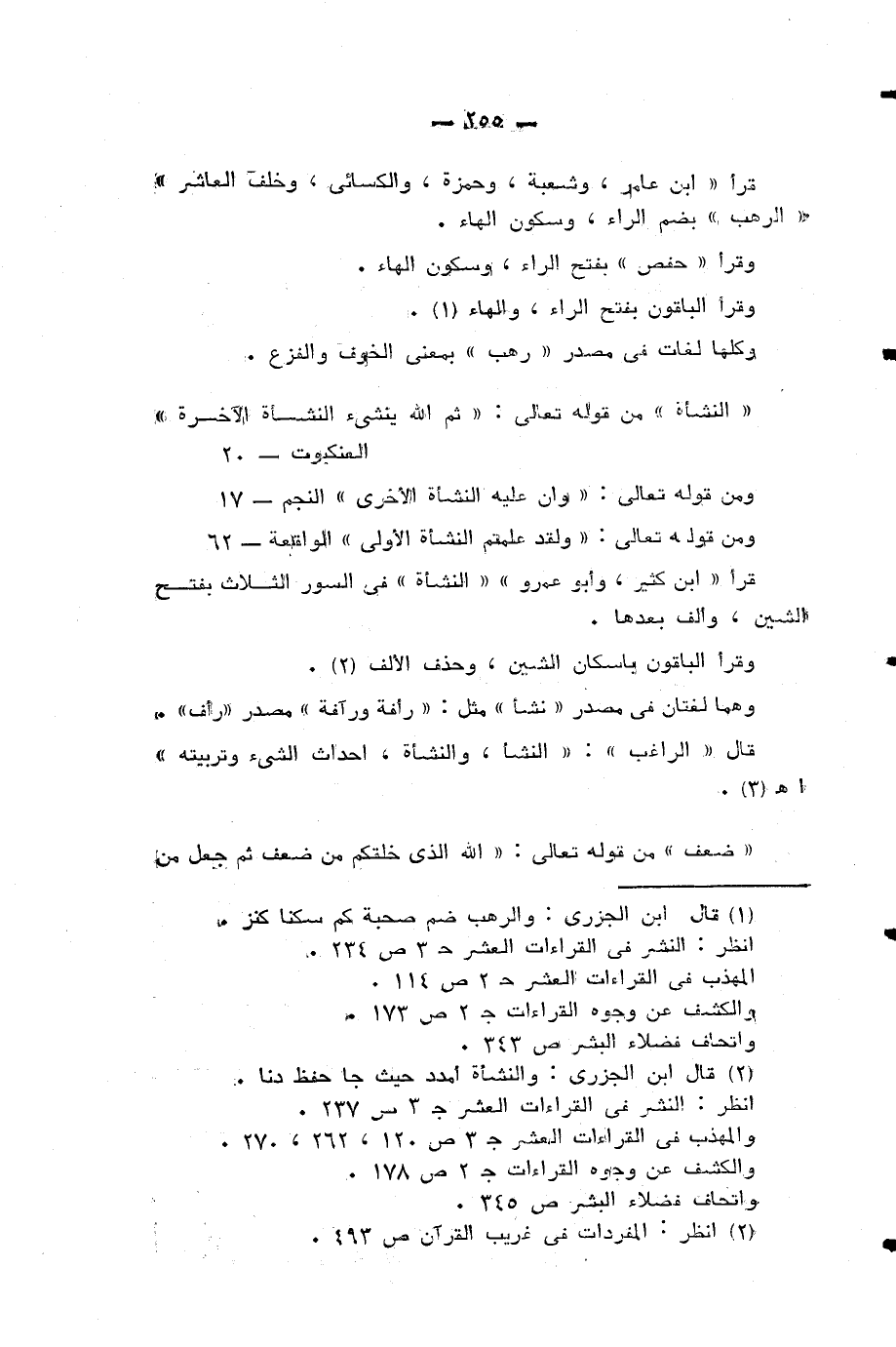 «النشأة» من قوله تعالى: «ثُمَّ اللَّهُ يُنْشِئُ النَّشْأَةَ الْآخِرَةَ (¬2) ومن قوله تعالى: وَأَنَّ عَلَيْهِ النَّشْأَةَ الْأُخْرى (¬3) ومن قوله تعالى: وَلَقَدْ عَلِمْتُمُ النَّشْأَةَ الْأُولى (¬4) قرأ «ابن كثير، وابو عمرو» «النشأة» في السور الثلاث بفتح الشين، والف بعدها.