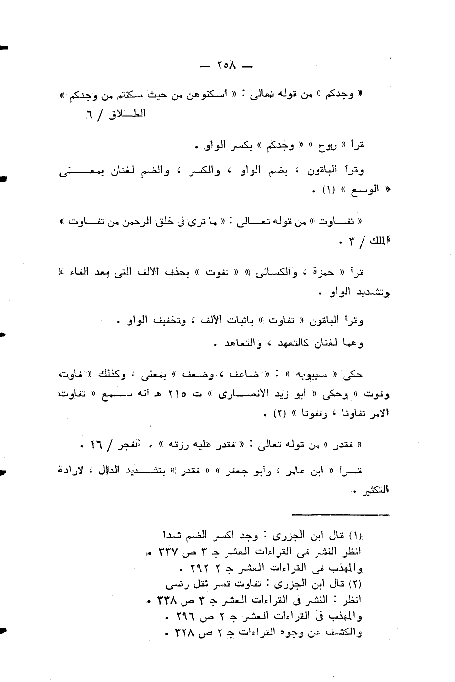 «تفاوت» من قوله تعالى: ما تَرى فِي خَلْقِ الرَّحْمنِ مِنْ تَفاوُتٍ (¬3) قرأ «حمزة، والكسائي» «تفوت» بحذف الالف التي بعد الفاء، وتشديد الواو.