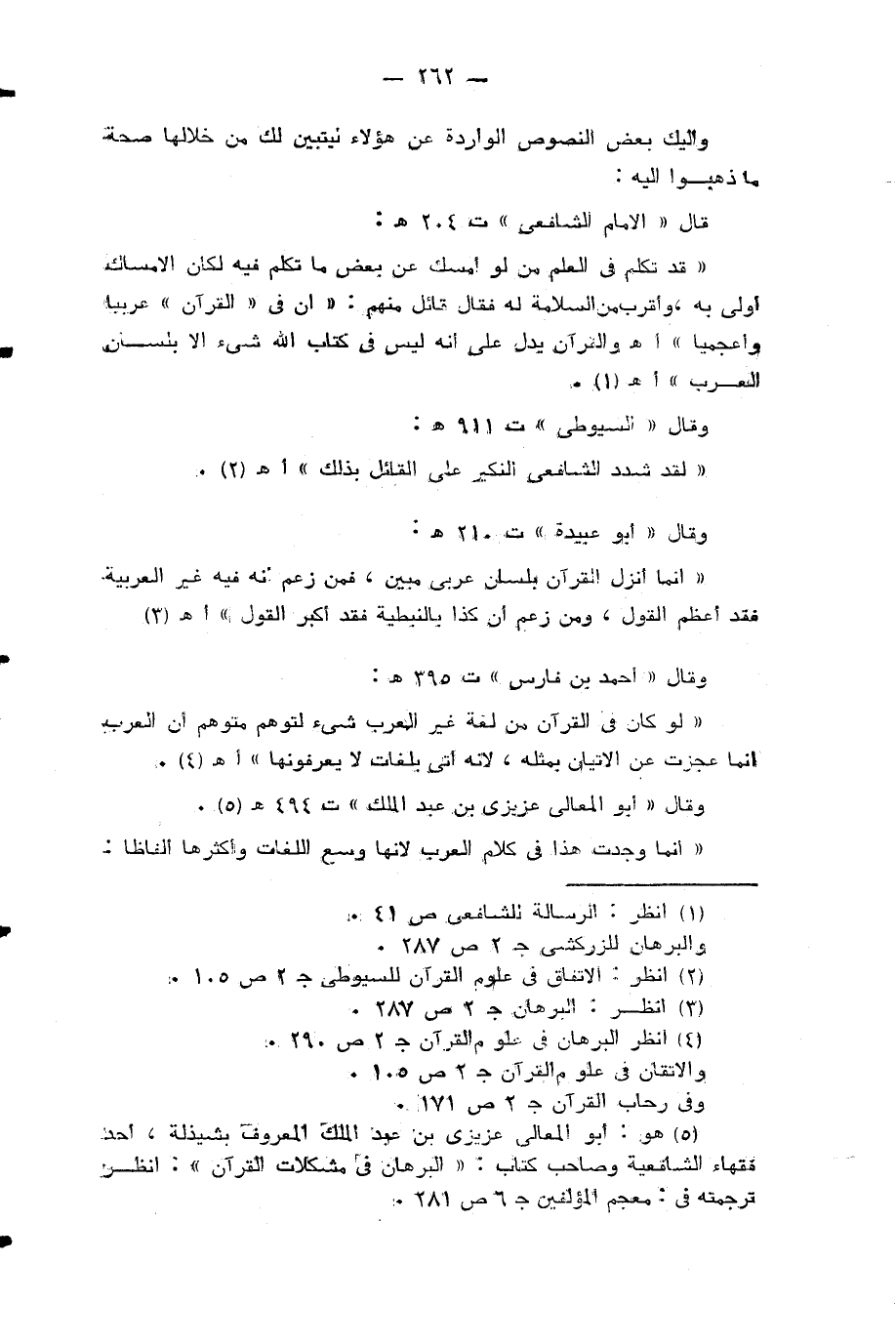 «قد تكلم في العلم من لو امسك عن بعض ما تكلم فيه لكان الامساك اولى به، واقرب من السلامة له فقال قائل منهم: «ان في «القرآن» عربيا واعجميا» اهـ، والقرآن يدل على انه ليس في كتاب الله شيء الا بلسان العرب» اهـ (¬1).