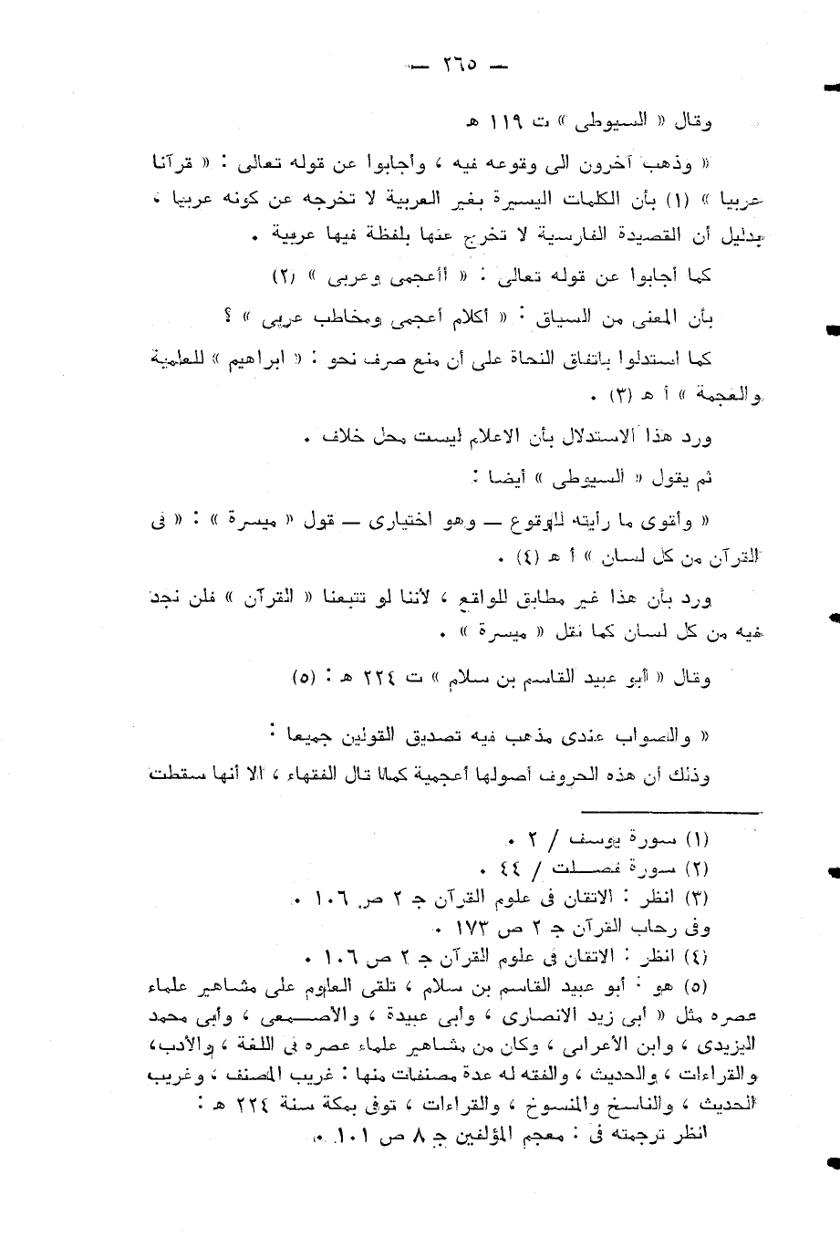 وقال «السيوطي» ت 119 هـ «وذهب آخرون الى وقوعه فيه، واجابوا عن قوله تعالى: قُرْآناً عَرَبِيًّا (¬1) بان الكلمات اليسيرة بغير العربية لا تخرجه عن كونه عربيا، بدليل ان القصيدة الفارسية لا تخرج عنها بلفظة فيها عربية.