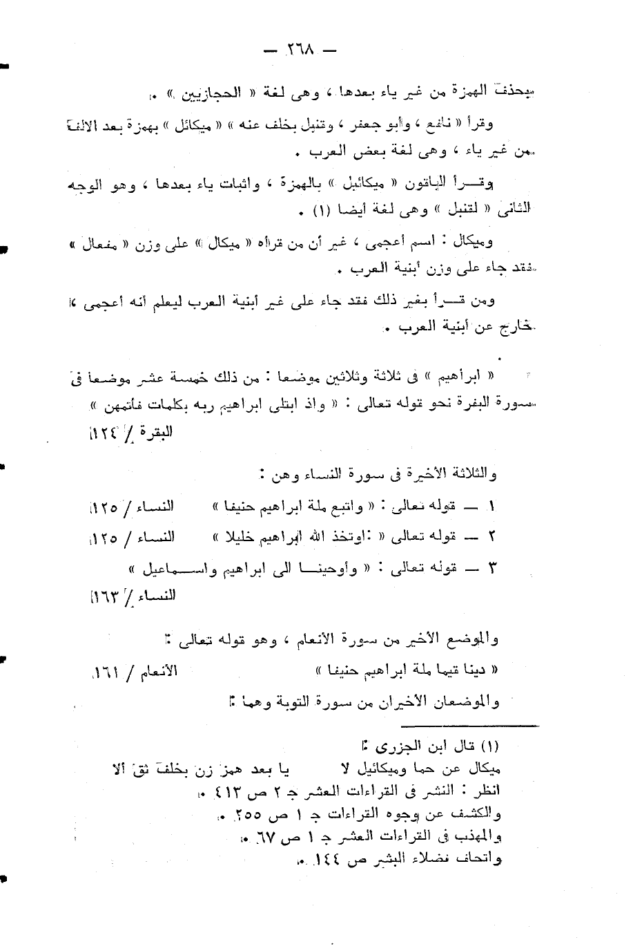 «إبراهيم» في ثلاثة وثلاثين موضعا: من ذلك خمسة عشر موضعا في سورة البقرة نحو قوله تعالى: وَإِذِ ابْتَلى إِبْراهِيمَ رَبُّهُ بِكَلِماتٍ فَأَتَمَّهُنَّ (¬2) والثلاثة الاخيرة في سورة النساء وهن: