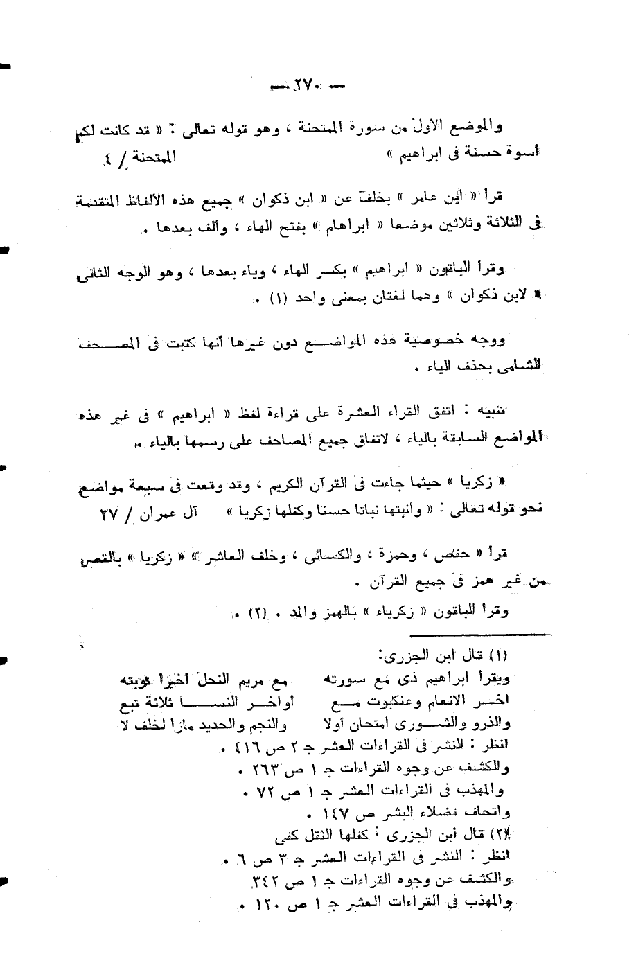 «زكريا» حيثما جاءت في القرآن الكريم، وقد وقعت في سبعة مواضع نحو قوله تعالى: وَأَنْبَتَها نَباتاً حَسَناً وَكَفَّلَها زَكَرِيَّا (¬3) قرأ «حفص، وحمزة، والكسائي، وخلف العاشر» «زكريا» بالقصر من غير همز في جميع القرآن».