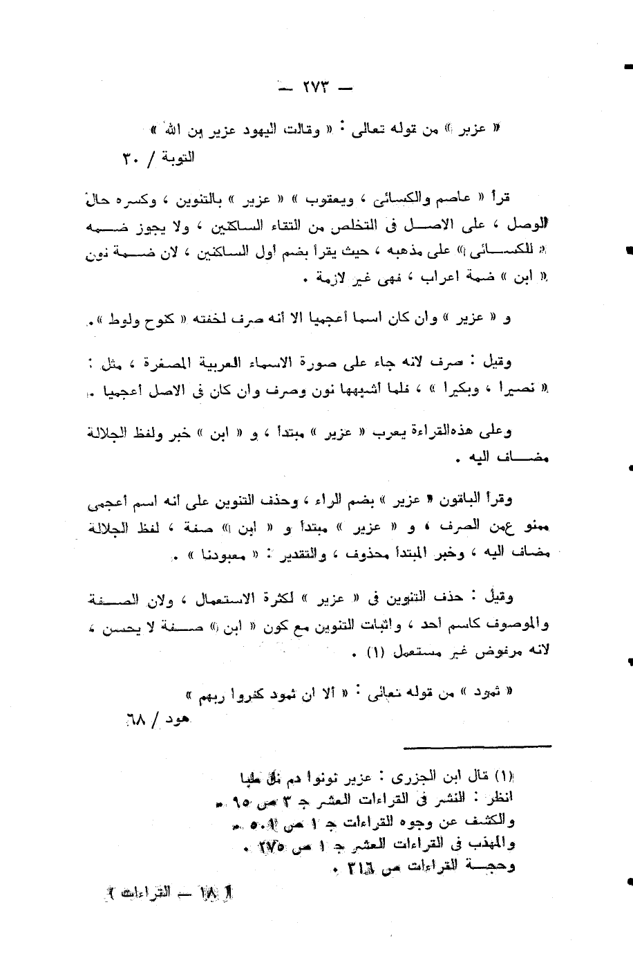 وقرأ الباقون «عزير» بضم الراء، وحذف التنوين على انه اسم اعجمي ممنوع من الصرف، و «عزير» مبتدأ و «ابن» صفة، لفظ الجلالة مضاف اليه، وخبر المبتدأ محذوف، والتقدير: «معبودنا».