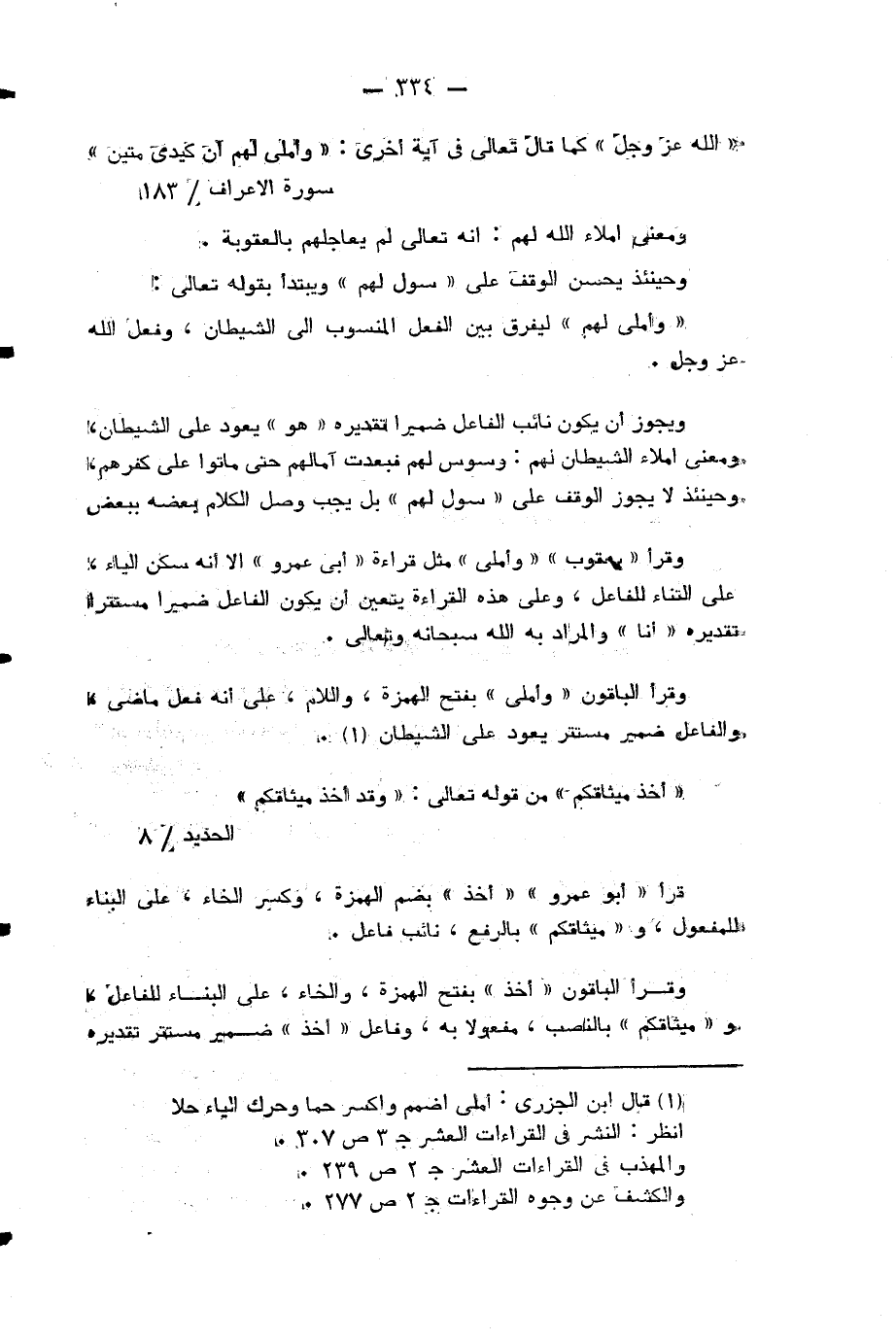 ويجوز ان يكون نائب الفاعل ضميرا تقديره «هو» يعود على الشيطان، ومعنى املاء الشيطان لهم: وسوس لهم فبعدت آمالهم حتى ماتوا على كفرهم، وحينئذ لا يجوز الوقف على «سول لهم» بل يجب وصل الكلام بعضه ببعض وقرأ «يعقوب» «واملي» مثل قراءة «ابي عمرو» الا انه سكن الياء، على البناء للفاعل، وعلى هذه القراءة يتعين ان يكون الفاعل ضميرا مستترا تقديره «انا» والمراد به الله سبحانه وتعالى.