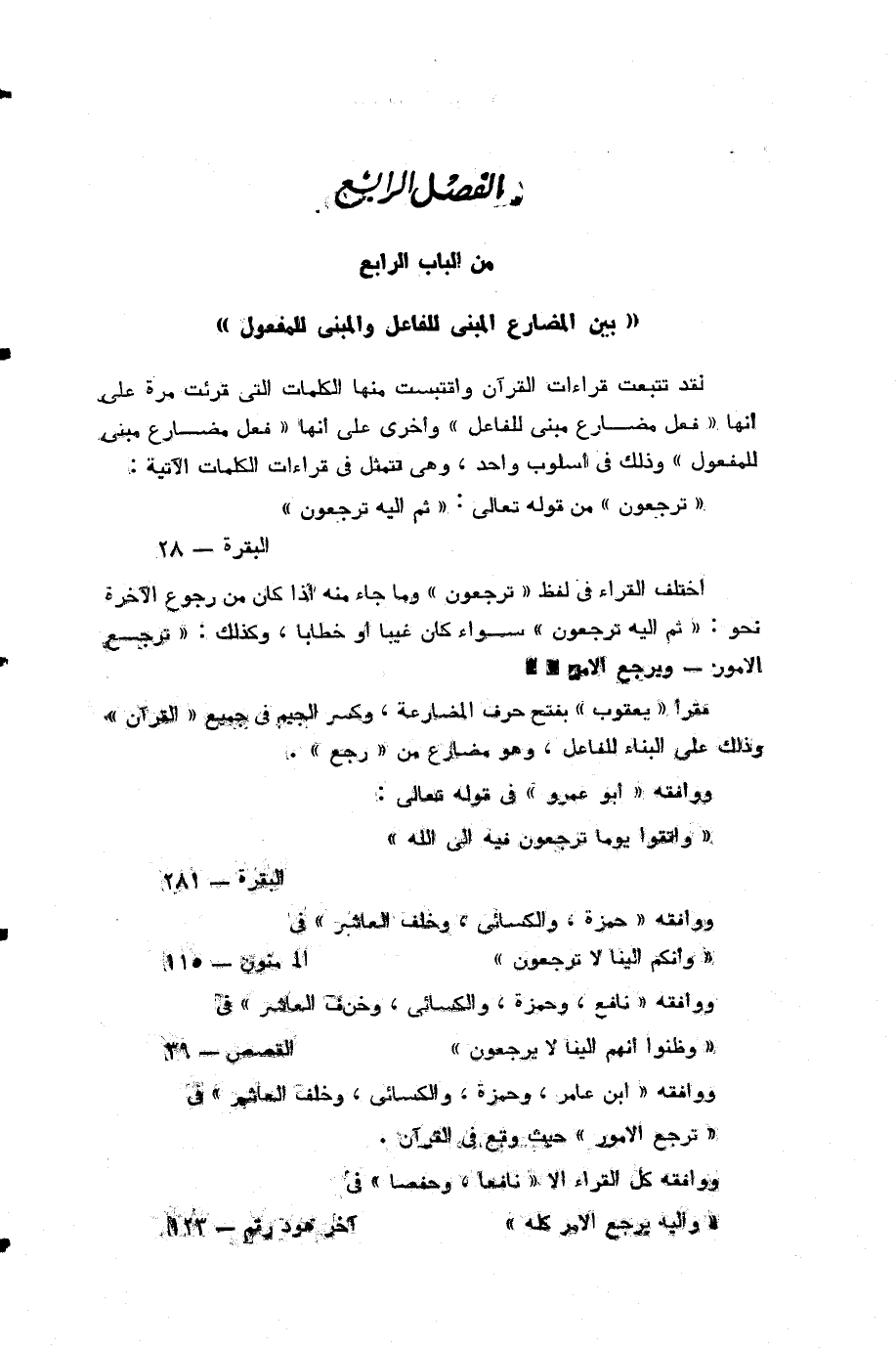 لقد تتبعت قراءات القرآن واقتبست منها الكلمات التي قرأت مرة على انها «فعل مضارع مبني للفاعل» واخرى على انها «فعل مضارع مبني للمفعول» وذلك في اسلوب واحد، وهي تتمثل في قراءات الكلمات الآتية:
