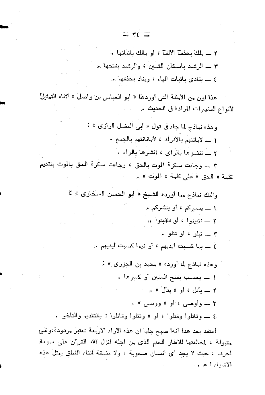 اعتقد بعد هذا أنه اصبح جليا ان هذه الآراء الأربعة تعتبر مردودة، وغير مقبولة، لمخالفتها للاطار العام الذي من اجله أنزل الله القرآن على سبعة أحرف، حيث لا يجد أي إنسان صعوبة، ولا مشقة أثناء النطق بمثل هذه الأشياء أهـ.