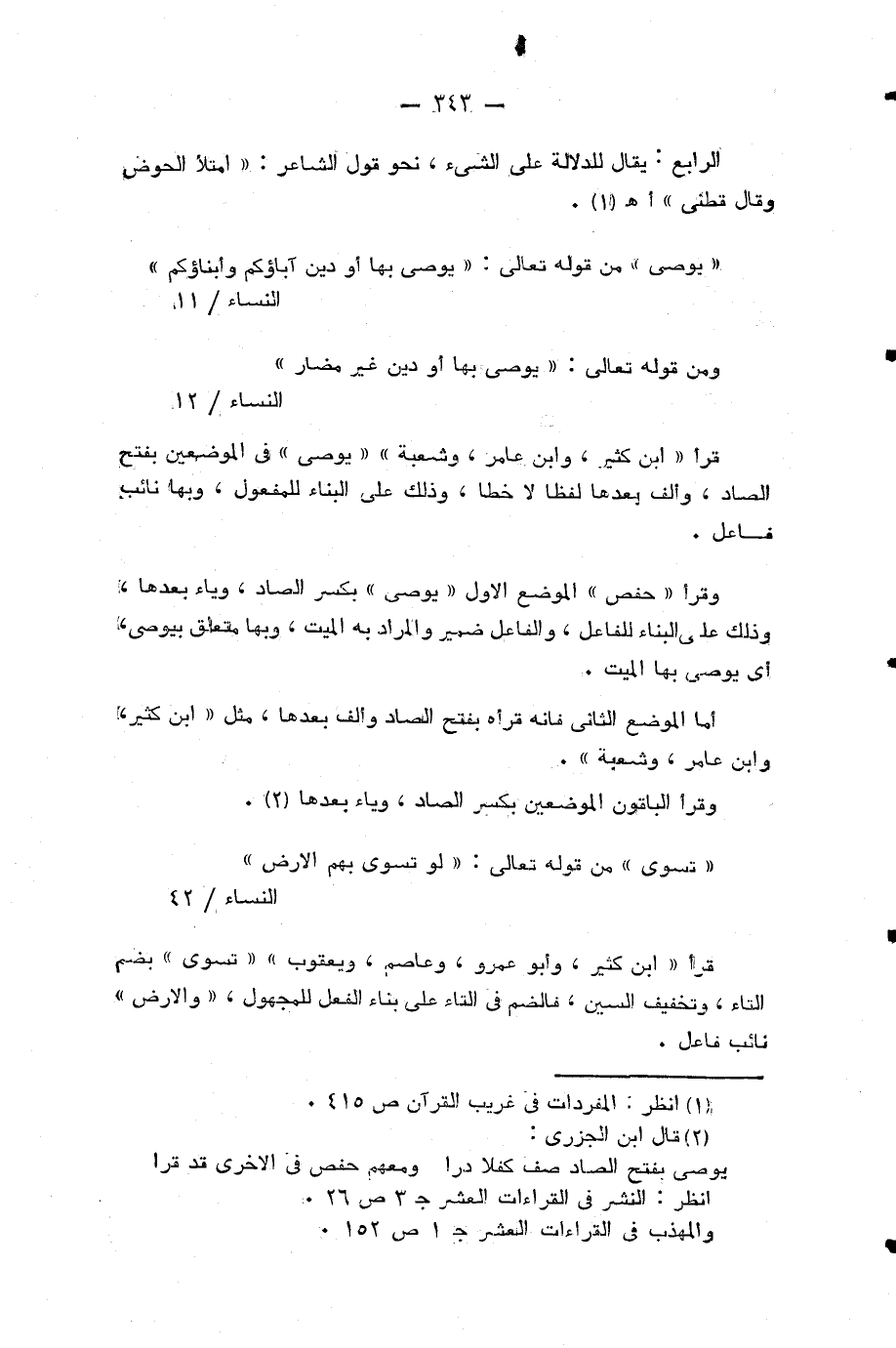 قرأ «ابن كثير، وابن عامر، وشعبة» «يوصى» في الموضعين بفتح الصاد، والف بعدها لفظا لا خطا، وذلك على البناء للمفعول، وبها نائب فاعل.