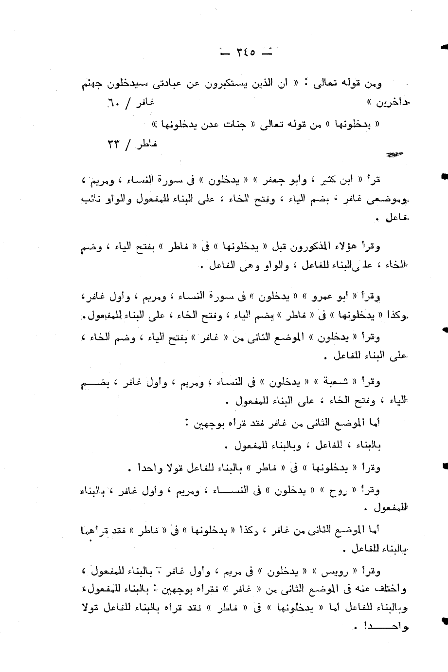 قرأ «ابن كثير، وأبو جعفر» «يدخلون» في سورة النساء، ومريم، وموضعي غافر، بضم الياء، وفتح الخاء، على البناء للمفعول والواو نائب فاعل.