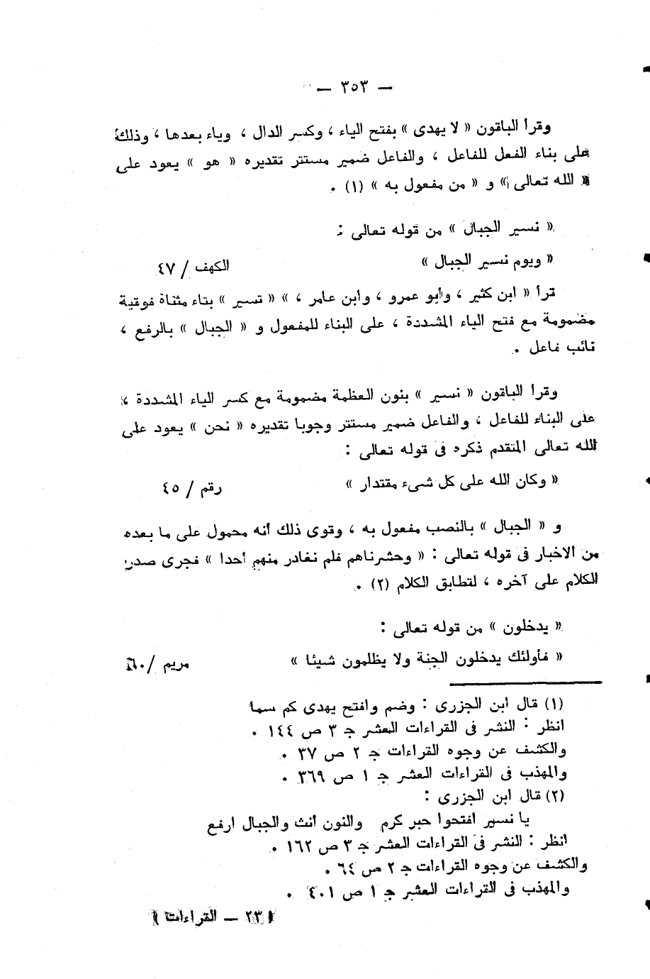 وقرأ الباقون «نسير» بنون العظمة مضمومة مع كسر الياء المشددة، على البناء للفاعل، والفاعل ضمير مستتر وجوبا تقديره «نحن» يعود على الله تعالى المتقدم ذكره في قوله تعالى: وَكانَ اللَّهُ عَلى كُلِّ شَيْءٍ مُقْتَدِراً (¬3).