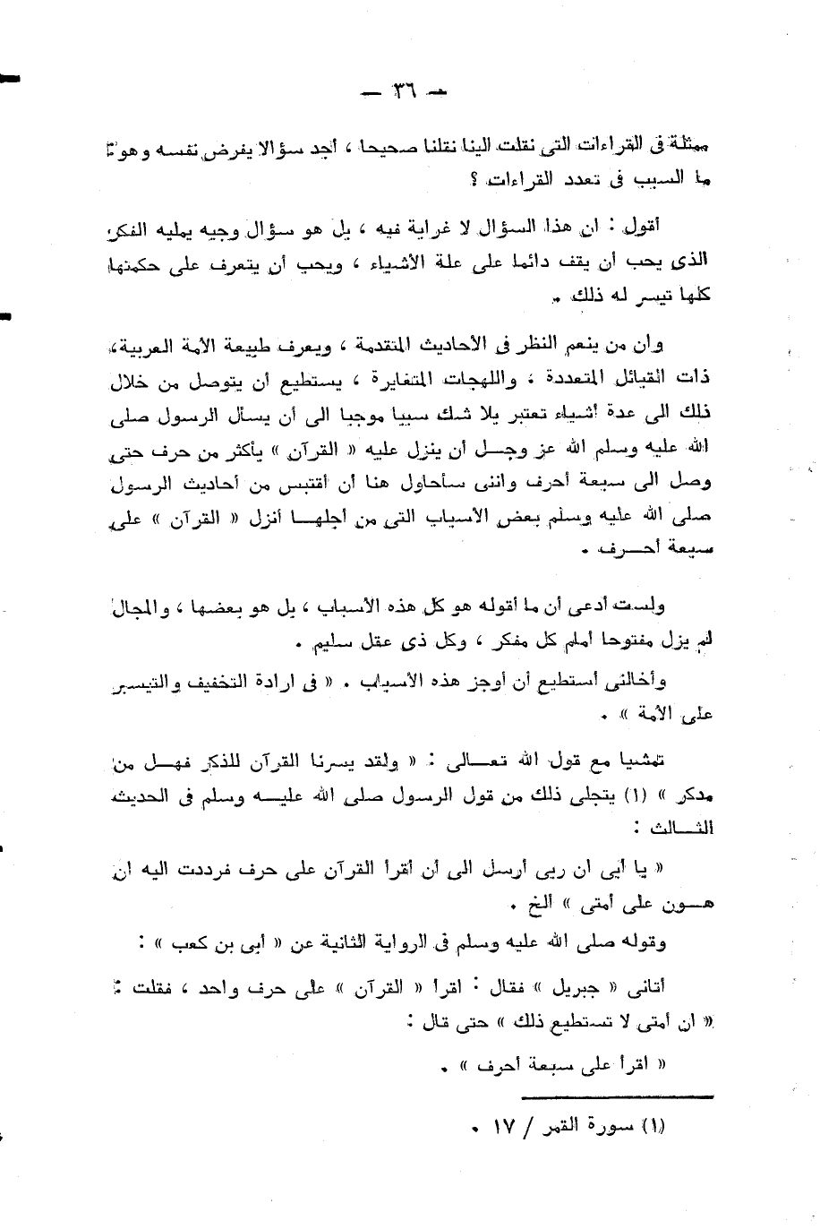 وان من ينعم النظر في الأحاديث المتقدمة، ويعرف طبيعة الأمة العربية، ذات القبائل المتعددة، واللهجات المتغايرة، يستطيع ان يتوصل من خلال ذلك الى عدة أشياء تعتبر بلا شك سببا موجبا الى أن يسأل الرسول صلى الله عليه وسلم الله عز وجل ان ينزل عليه «القرآن» بأكثر من حرف حتى وصل الى سبعة احرف. وانني سأحاول هنا ان اقتبس من أحاديث الرسول صلى الله عليه وسلم بعض الأسباب التي من اجلها أنزل «القرآن» على سبعة احرف.