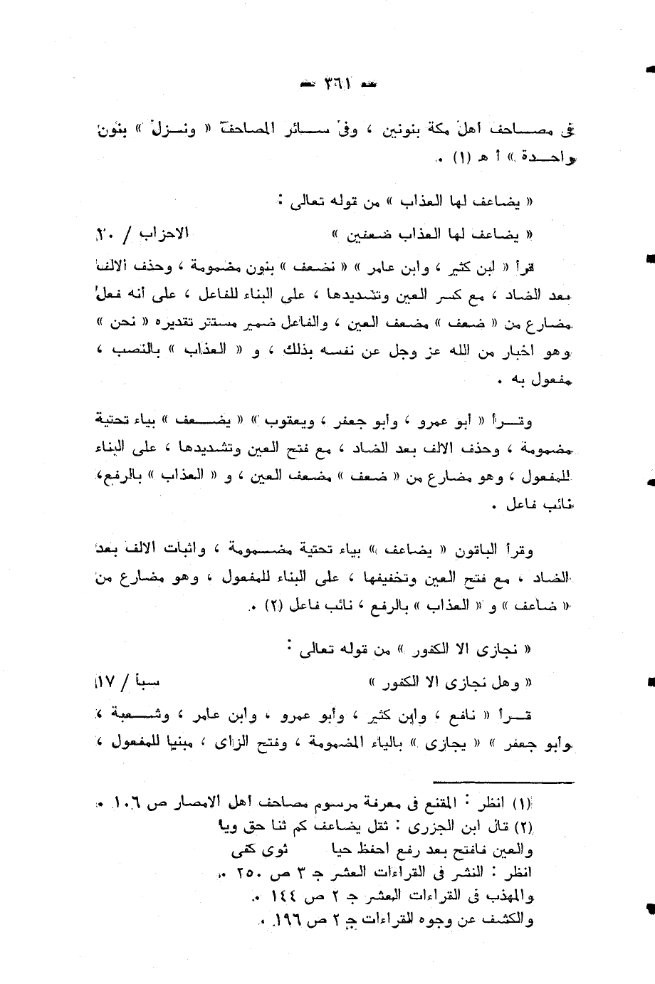 وقرأ الباقون «يضاعف» بياء تحتية مضمومة، واثبات الالف بعد الضاد، مع فتح العين وتخفيفها، على البناء للمفعول، وهو مضارع من «ضاعف» و «العذاب» بالرفع، نائب فاعل (¬3).