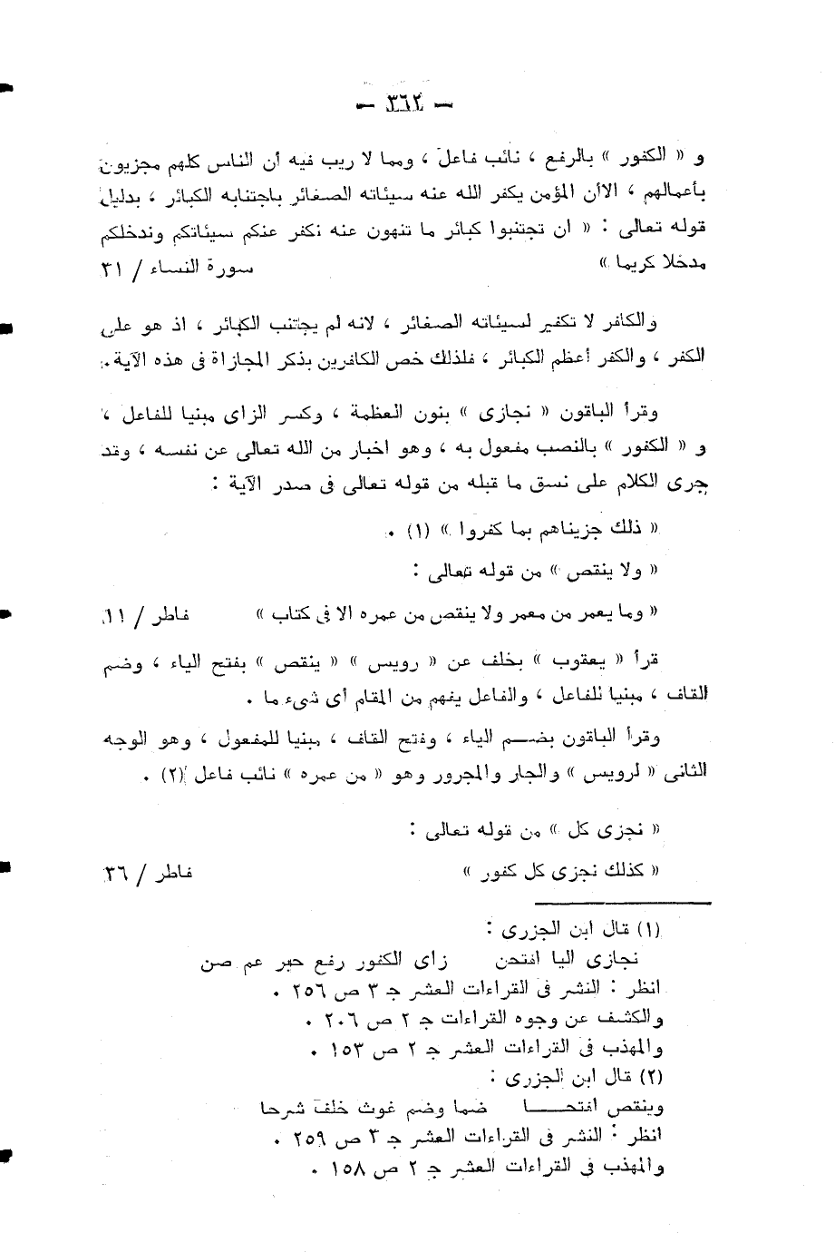 و «الكفور» بالرفع، نائب فاعل، ومما لا ريب فيه أن الناس كلهم مجزيون بأعمالهم، الا أن المؤمن يكفر الله عنه سيئاته الصغائر باجتنابه الكبائر، بدليل قوله تعالى: إِنْ تَجْتَنِبُوا كَبائِرَ ما تُنْهَوْنَ عَنْهُ نُكَفِّرْ عَنْكُمْ سَيِّئاتِكُمْ وَنُدْخِلْكُمْ مُدْخَلًا كَرِيماً (¬1).