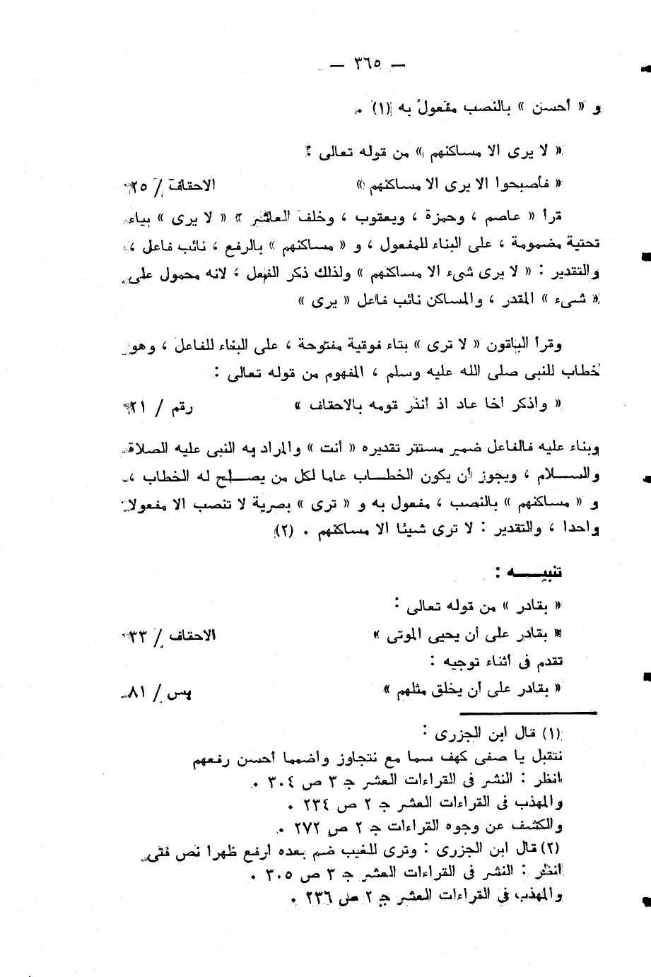 وبناء عليه فالفاعل ضمير مستتر تقديره «أنت» والمراد به النبي عليه الصلاة والسلام، ويجوز ان يكون الخطاب عاما لكل من يصلح له الخطاب، و «مساكنهم» بالنصب، مفعول به و «ترى» بصرية لا تنصب الا مفعولا واحدا، والتقدير: لا ترى شيئا الا مساكنهم (¬4).