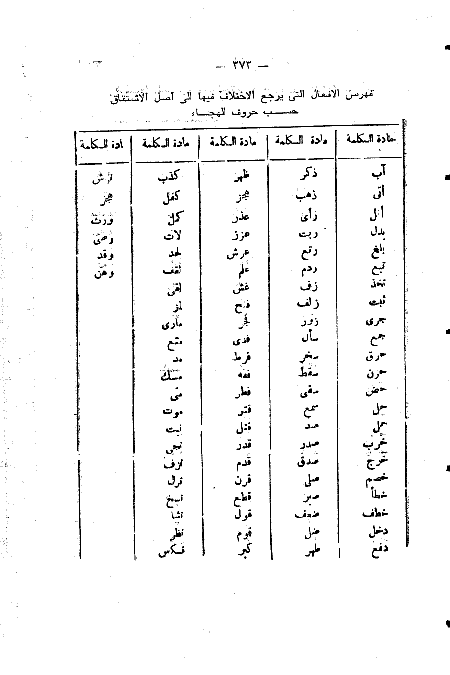 فهرس الافعال التي يرجع الاختلاف فيها الى أصل الاشتقاق حسب حروف الهجاء مادة الكلمة/ مادة الكلمة/ مادة الكلمة/ مادة الكلمة/ مادة الكلمة/ آب/ ذكر/ ظهر/ كذب/ نوش/ أتى/ ذهب/ عجز/ كفل/ هجر/