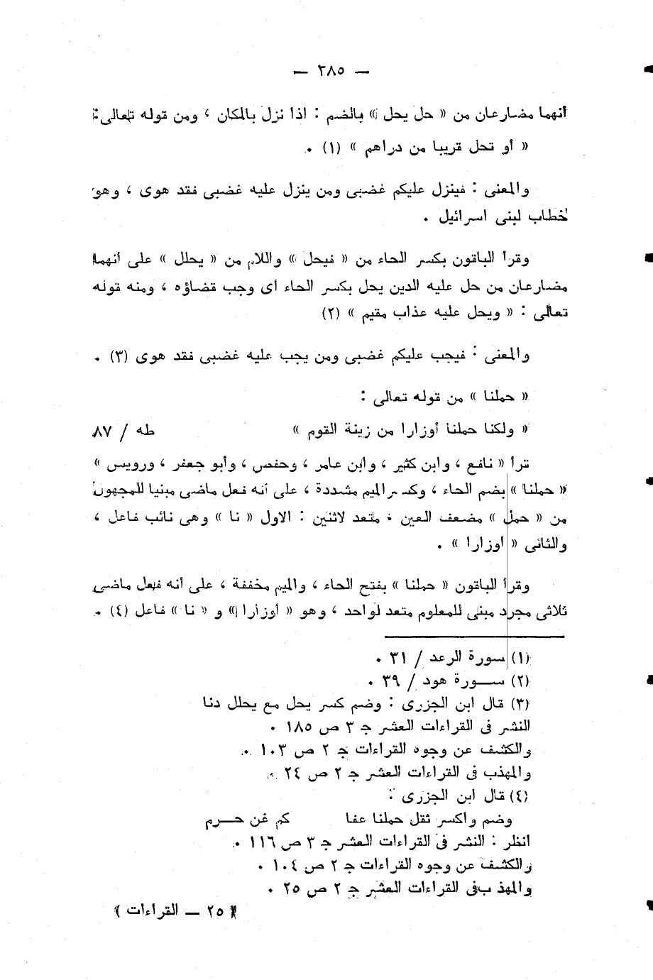 وقرأ الباقون «حملنا» بفتح الحاء، والميم مخففة، على أنه فعل ماض ثلاثي مجرد مبني للمعلوم متعد لواحد، وهو «أوزارا» و «نا» فاعل (¬5).