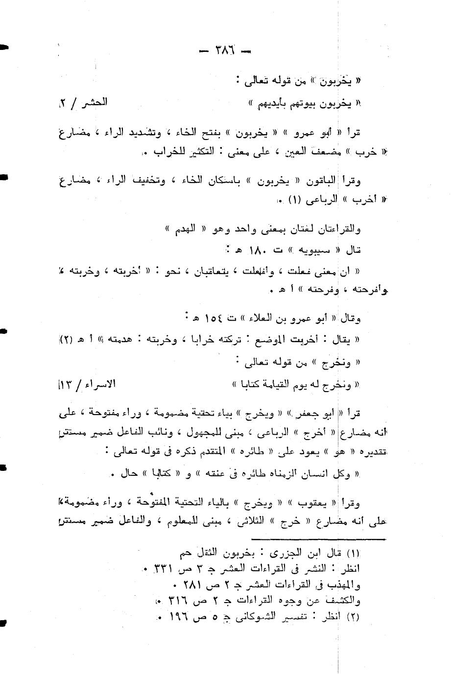 «يقال: أخربت الموضع: تركته خرابا، وخربته: هدمته» أهـ (¬3) «ونخرج» من قوله تعالى: وَنُخْرِجُ لَهُ يَوْمَ الْقِيامَةِ كِتاباً (¬4).