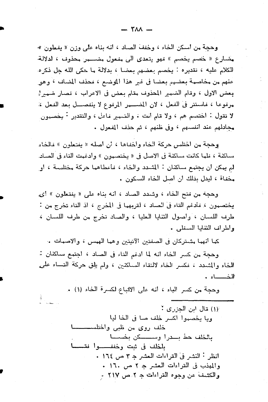 وحجة من فتح الخاء، وشدد الصاد، أنه بناه على «يفتعلون» أي يختصمون، فأدغم التاء في الصاد، لقربهما في المخرج، اذ التاء تخرج من: