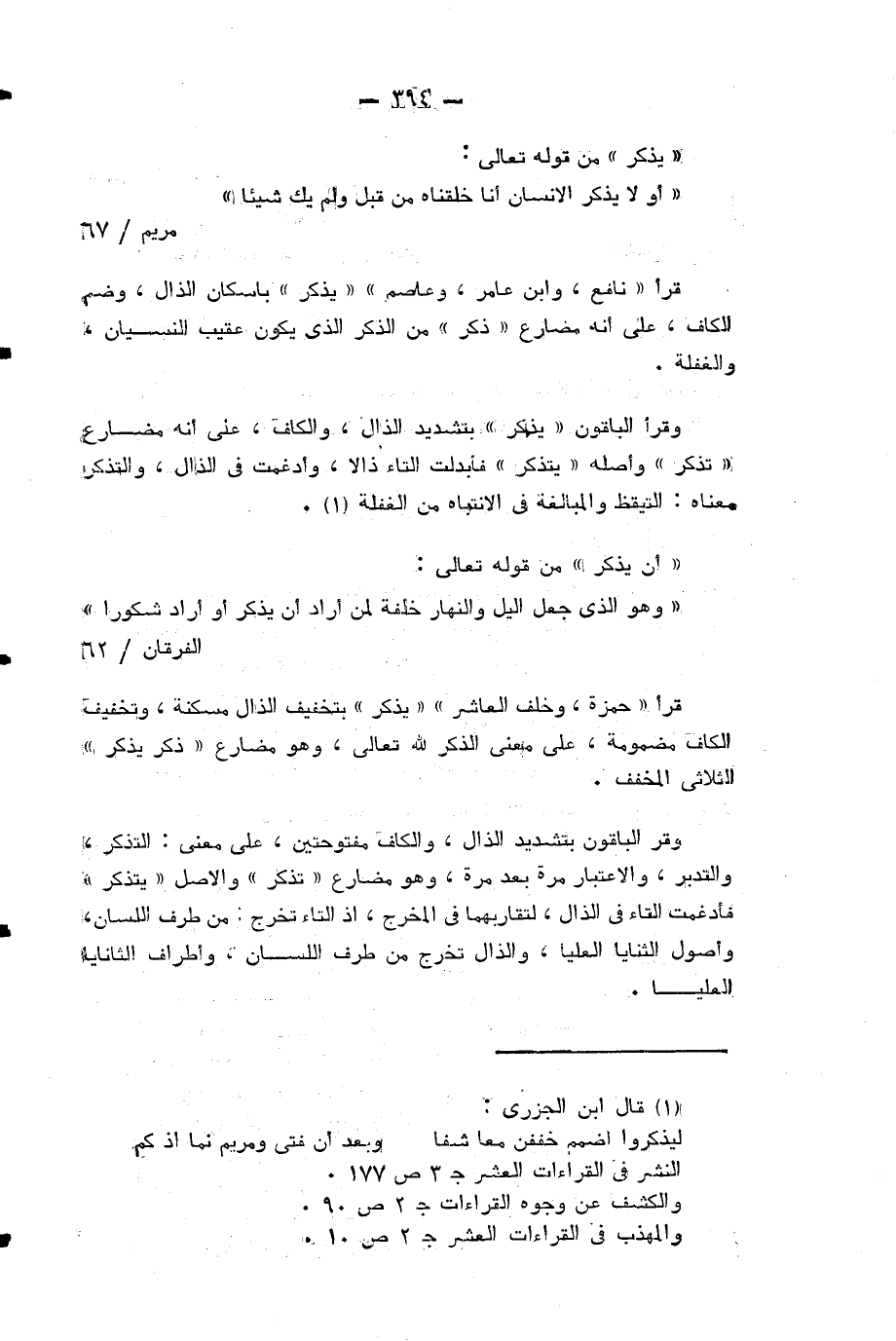 وقر الباقون بتشديد الذال، والكاف مفتوحتين، على معنى: التذكر، والتدبر، والاعتبار مرة بعد مرة، وهو مضارع «تذكر» والاصل «يتذكر» فأدغمت التاء في الذال، لتقاربهما في المخرج، اذ التاء تخرج، من طرف اللسان، وأصول الثنايا العليا، والذال تخرج من طرف اللسان، وأطراف الثنايا العليا.