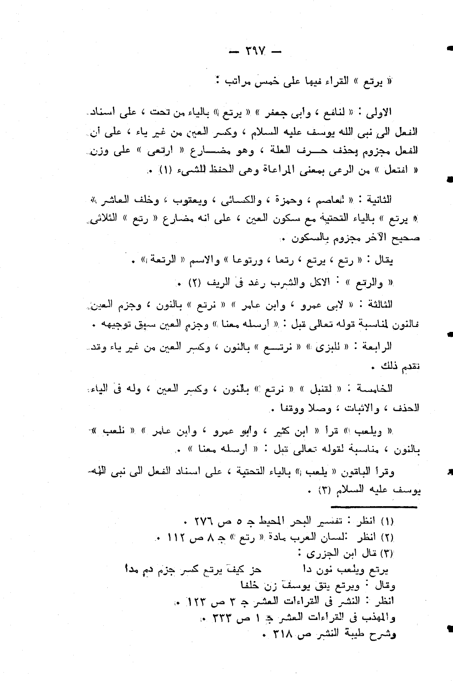 الثالثة: «لأبي عمرو، وابن عامر» «نرتع» بالنون، وجزم العين فالنون لمناسبة قوله تعالى قبل: أَرْسِلْهُ مَعَنا وجزم العين سبق توجيهه.