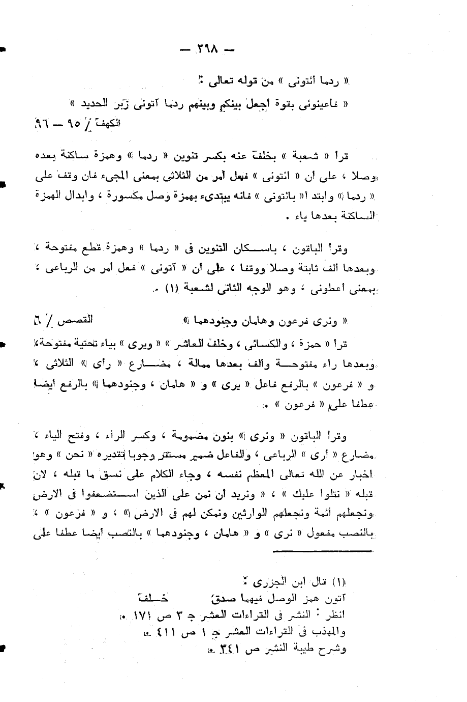 وقرأ الباقون، باسكان التنوين في «ردما» وهمزة قطع مفتوحة، وبعدها ألف ثابتة وصلا ووقفا، على أن «آتوني» فعل أمر من الرباعي، بمعنى اعطوني، وهو الوجه الثاني لشعبة (¬2).