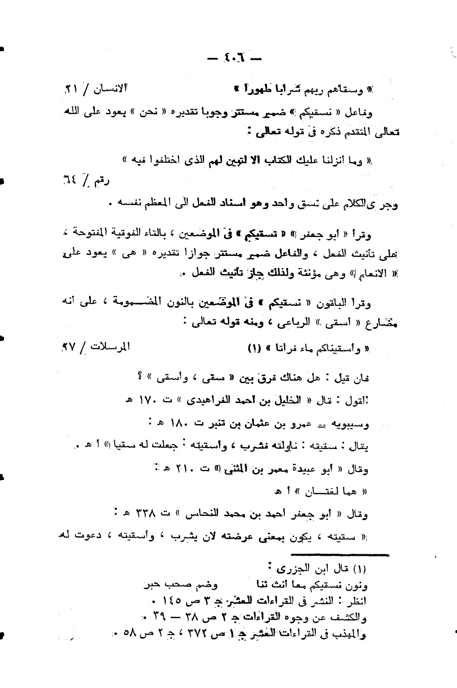 وقرأ الباقون «نسقيكم» في الموضعين بالنون المضمومة، على أنه مضارع «أسقى» الرباعي، ومنه قوله تعالى: وَأَسْقَيْناكُمْ ماءً فُراتاً (¬3).