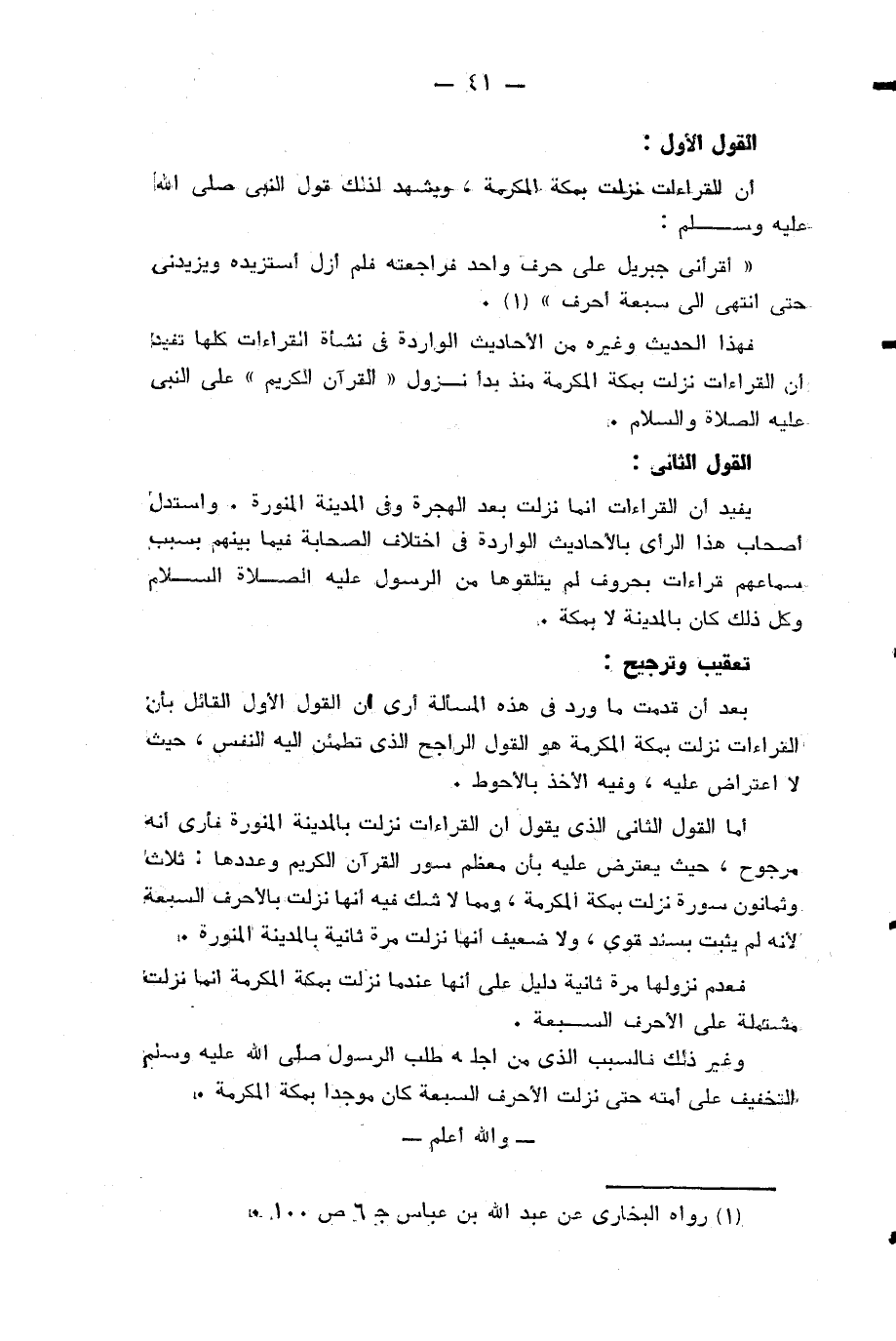 فهذا الحديث وغيره من الأحاديث الواردة في نشأة القراءات كلها تفيد ان القراءات نزلت بمكة المكرمة منذ بدء نزول «القرآن الكريم» على النبي عليه الصلاة والسلام.