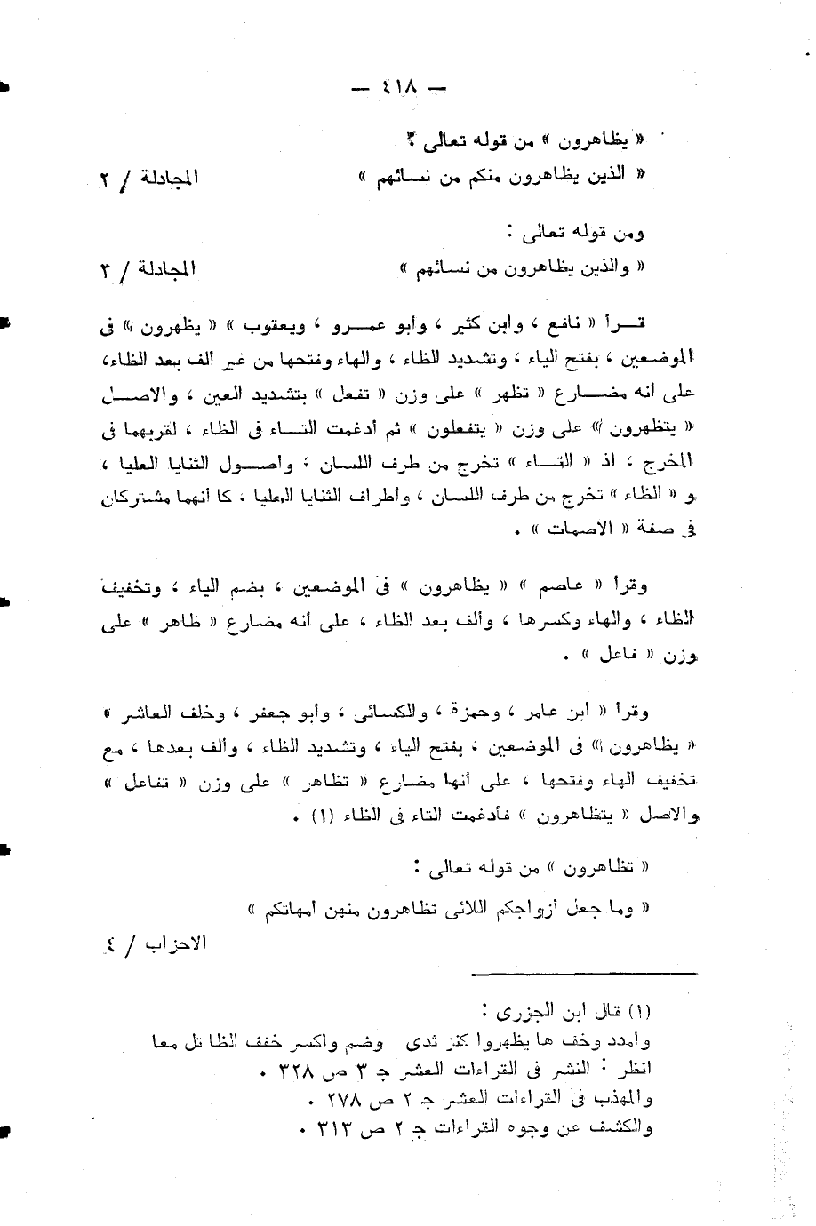 تخفيف الهاء وفتحها، على أنها مضارع «تظاهر» على وزن «تفاعل» والاصل «يتظاهرون» فأدغمت التاء في الظاء (¬3).