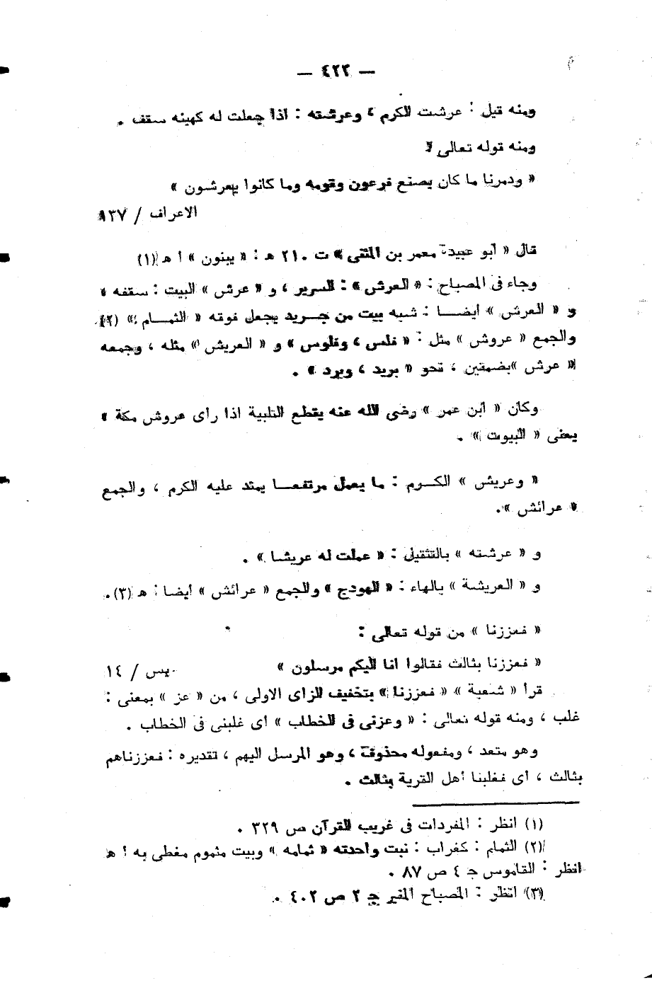 وجاء في المصباح: «العرش»: السرير، و «عرش» البيت: سقفه، و «العرش» أيضا: شبه بيت من جريد يجعل فوقه «الثمام» (¬3) والجمع «عروش»
