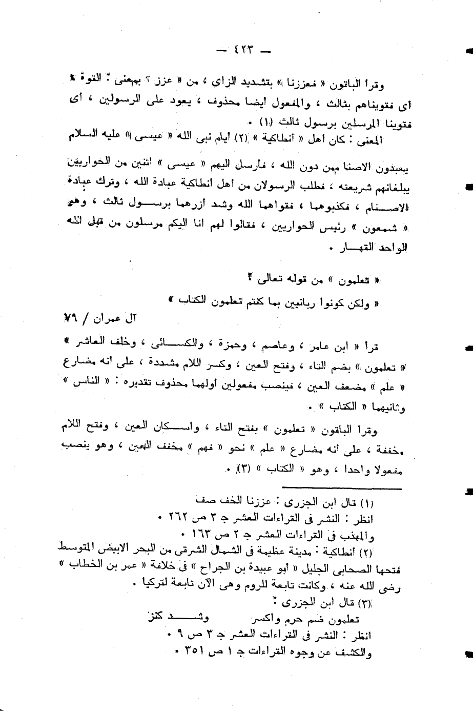 قرأ «ابن عامر، وعاصم، وحمزة، والكسائي، وخلف العاشر» «تعلمون» بضم التاء، وفتح العين، وكسر اللام مشددة، على أنه مضارع «علم» مضعف العين، فينصب مفعولين أولهما محذوف تقديره: «الناس» وثانيهما «الكتاب».