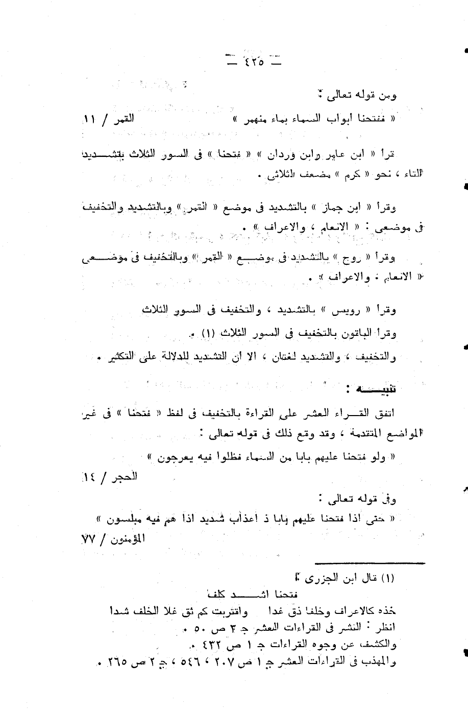 تنبيه: اتفق القراء العشر على القراءة بالتخفيف في لفظ «فتحنا» في غير المواضع المتقدمة، وقد وقع ذلك في قوله تعالى: وَلَوْ فَتَحْنا عَلَيْهِمْ باباً مِنَ السَّماءِ فَظَلُّوا فِيهِ يَعْرُجُونَ (¬3).