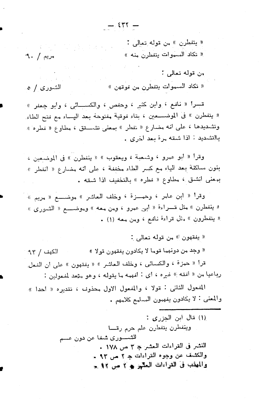 وقرأ «ابن عامر، وحمزة، وخلف العاشر» موضع «مريم» «ينفطرن» مثل قراءة «أبي عمرو، ومن معه» وموضع «الشورى» «يتفطرون» مثل قراءة نافع، ومن معه (¬3).