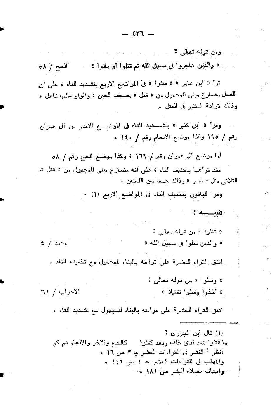 تنبيه: «قتلوا» من قوله تعالى: وَالَّذِينَ قُتِلُوا فِي سَبِيلِ اللَّهِ (¬3).