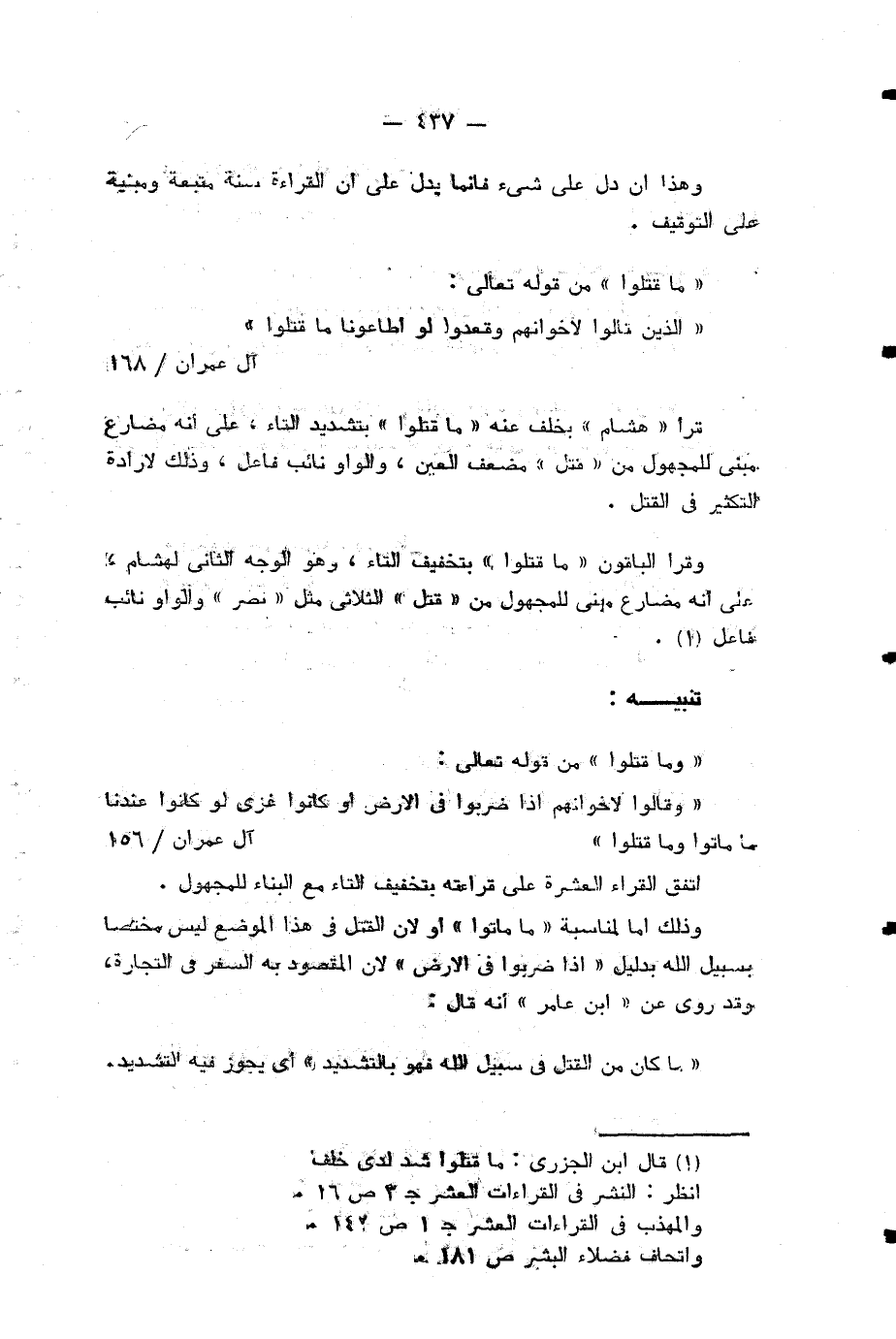 (¬2) قال ابن الجزرى: ما قتلوا شد لدى خلف انظر: النشر في القراءات العشر ج 3 ص 16.