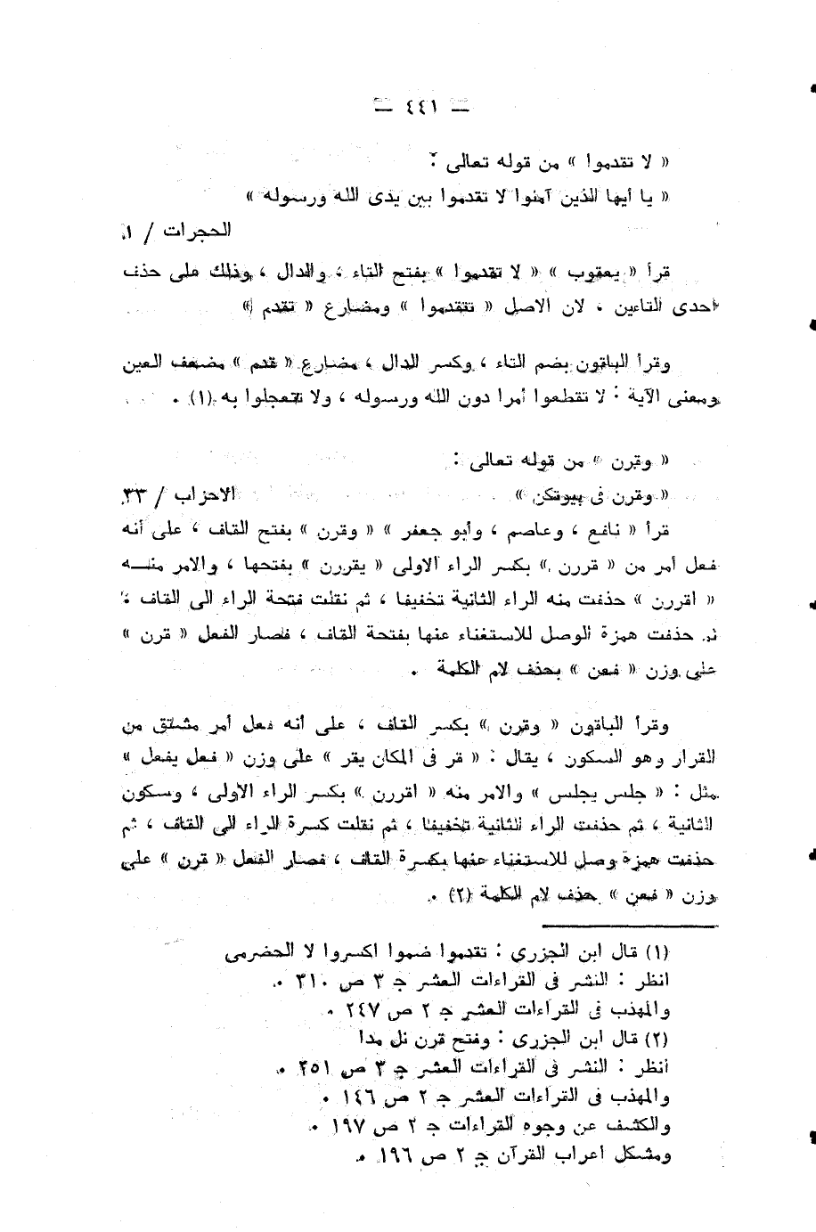 وقرأ الباقون «وقرن» بكسر القاف، على أنه فعل أمر مشتق من القرار وهو السكون، يقال: «قر في المكان يقر» على وزن «فعل يفعل» مثل: «جلس يجلس» والامر منه «أقررن» بكسر الراء الاولى، وسكون الثانية، ثم حذفت الراء الثانية تخفيفا، ثم نقلت كسرة الراء الى القاف، ثم حذفت همزة الوصل للاستغناء عنها بكسرة القاف، فصار الفعل «قرن» على وزن «فعن» بحذف لام الكلمة (¬4).