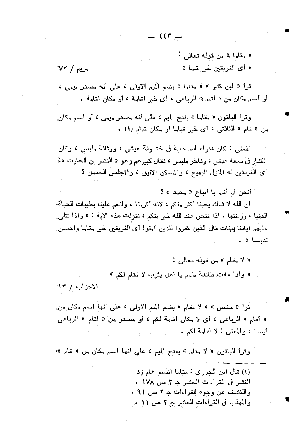 «مقاما» من قوله تعالى: أَيُّ الْفَرِيقَيْنِ خَيْرٌ مَقاماً (¬1).