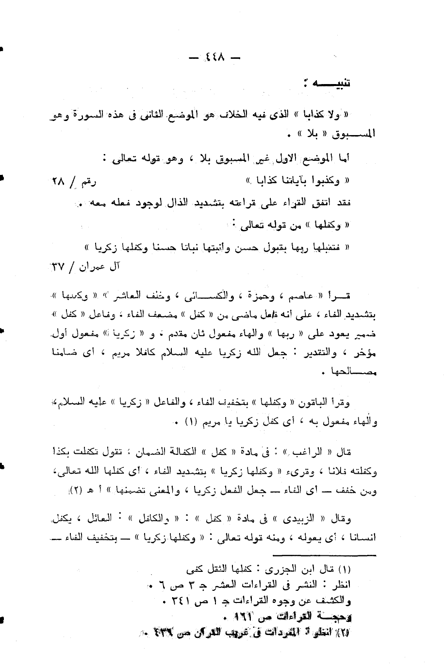 قال «الراغب»: في مادة «كفل» الكفالة الضمان، تقول تكفلت بكذا وكفلته فلانا، وقرئ «وكفلها زكريا» بتشديد الفاء، أي كفلها الله تعالى، ومن خفف- أي الفاء- جعل الفعل زكريا، والمعنى تضمنها» أهـ (¬4).