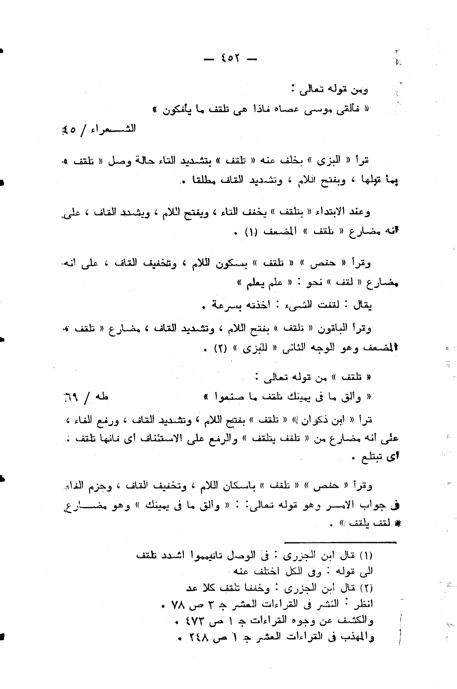 وقرأ الباقون «تلقف» بفتح اللام، وتشديد القاف، مضارع «تلقف» المضعف وهو الوجه الثاني «للبزي» (¬3).
