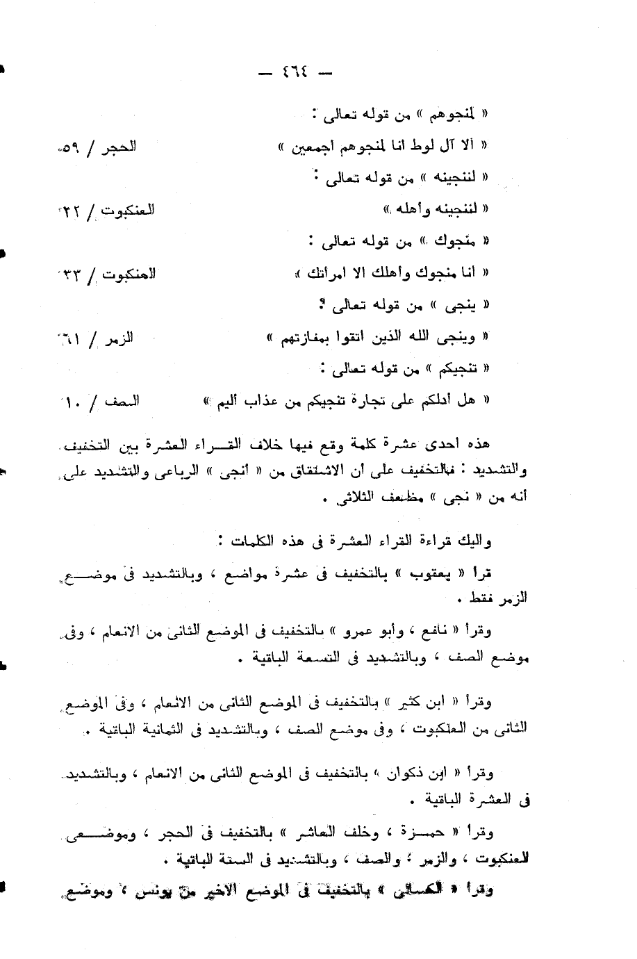 هذه احدى عشرة كلمة وقع فيها خلاف القراء العشرة بين التخفيف والتشديد: فالتخفيف على أن الاشتقاق من «أنجى» الرباعي والتشديد على أنه من «نجى» مضعف الثلاثي.