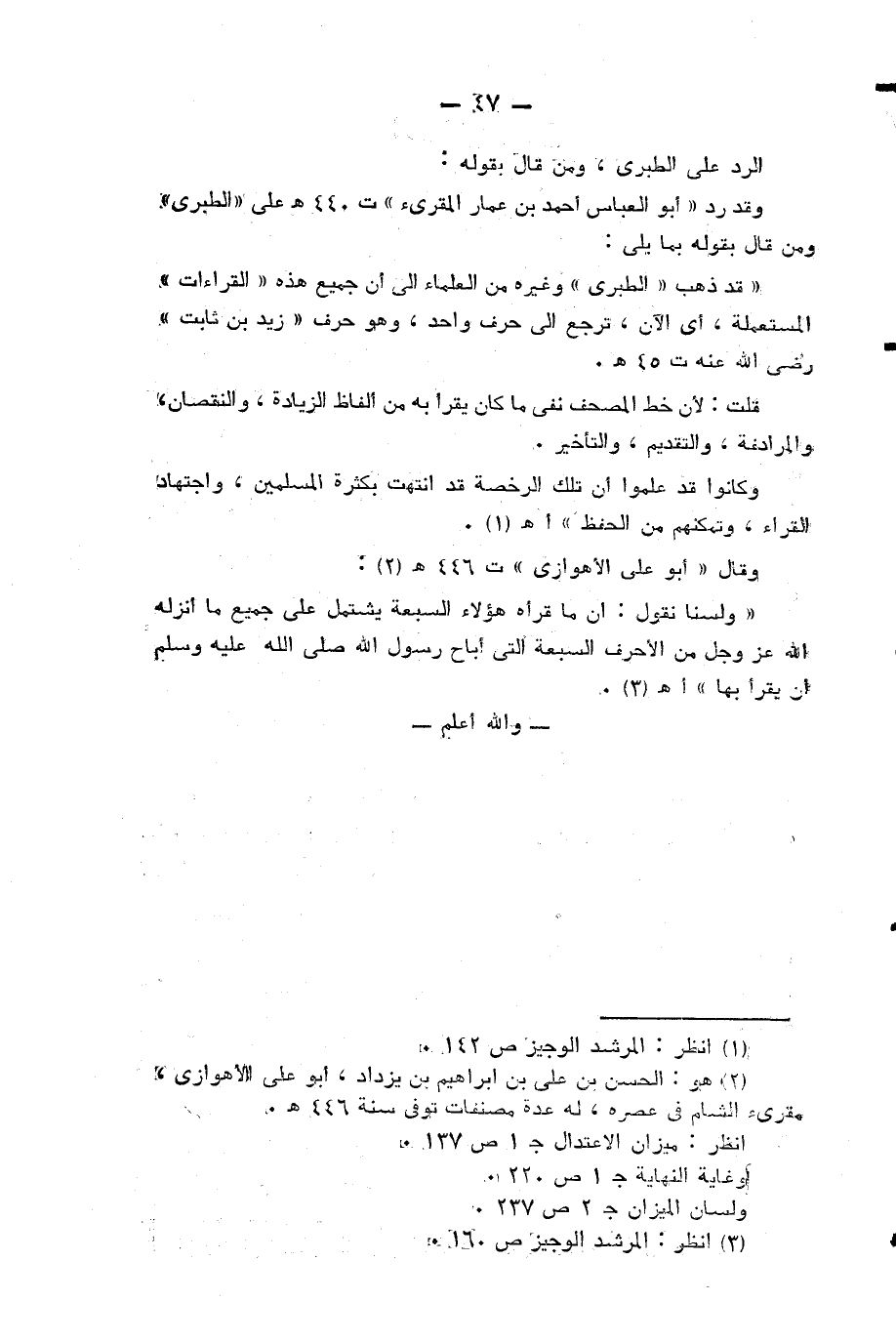 «قد ذهب «الطبري» وغيره من العلماء الى أن جميع هذه «القراءات» المستعملة، أي الآن، ترجع الى حرف واحد وهو حرف «زيد بن ثابت» رضي الله عنه ت 45 هـ.